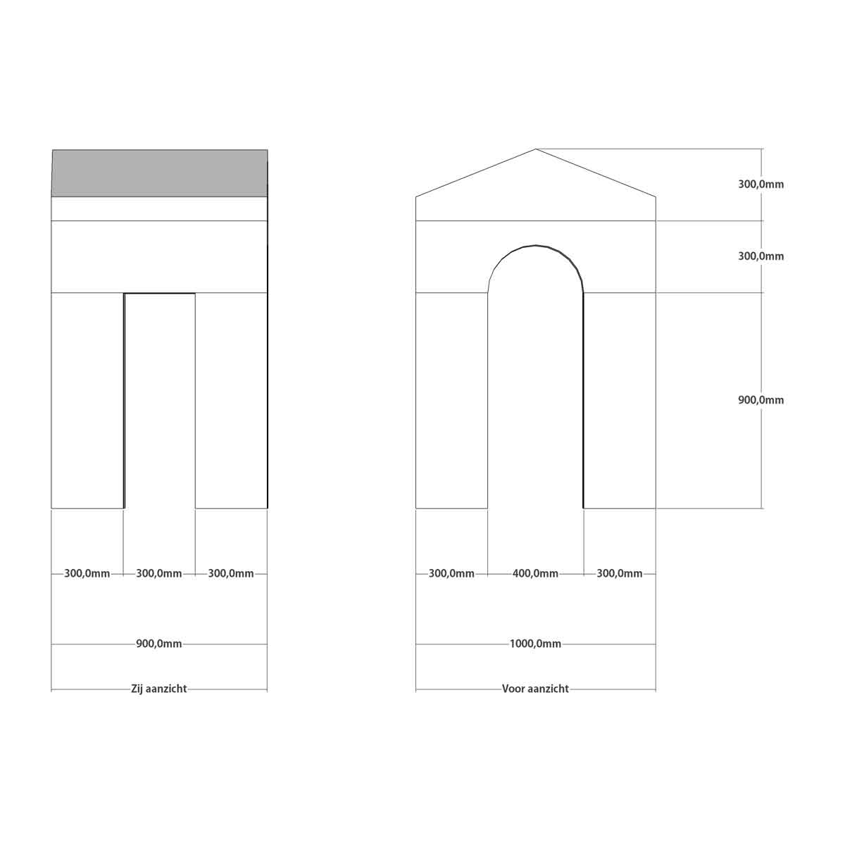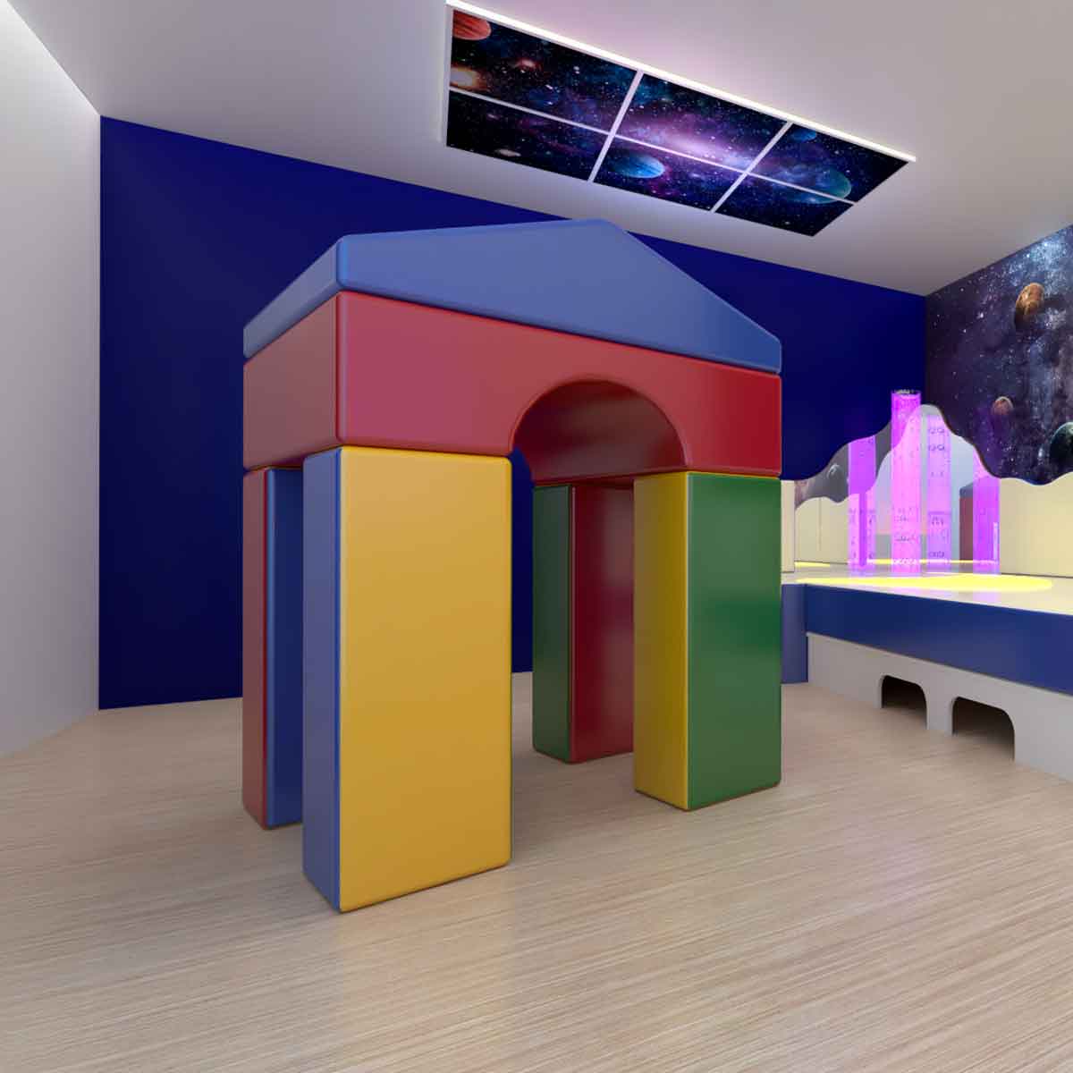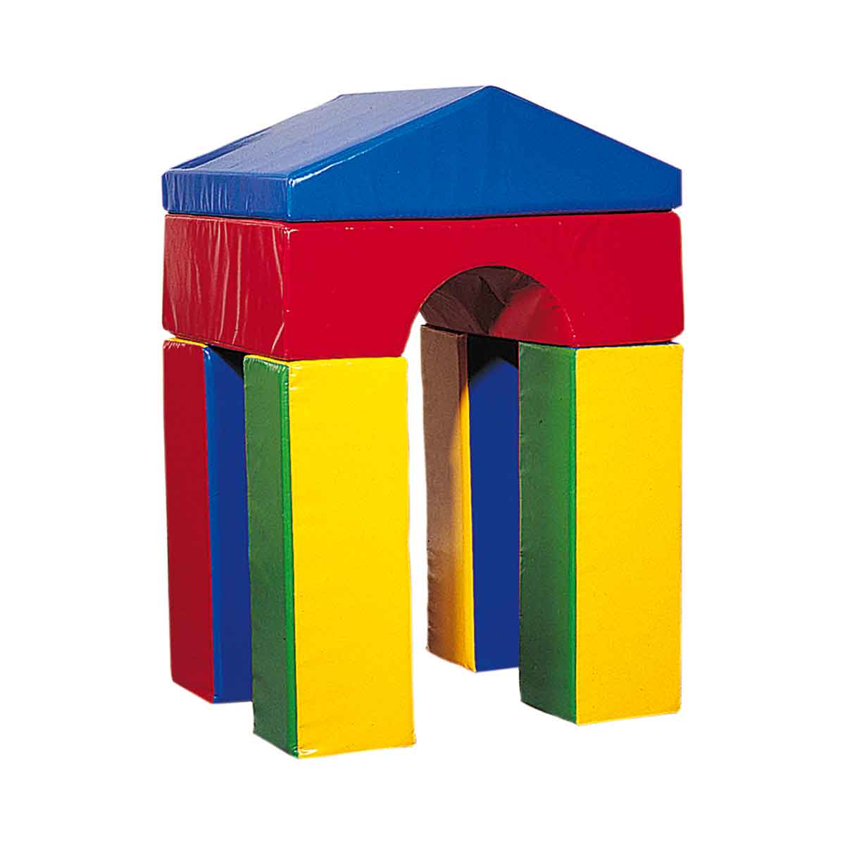 Dieser Bausatz besteht aus sechs bunten Einzelteilen: - 4 Pfosten (Maße 30x30x90 cm) - 1 Tunnel (Maße 90x90x30 cm) - 1 Dach (Maße 90x90x30)