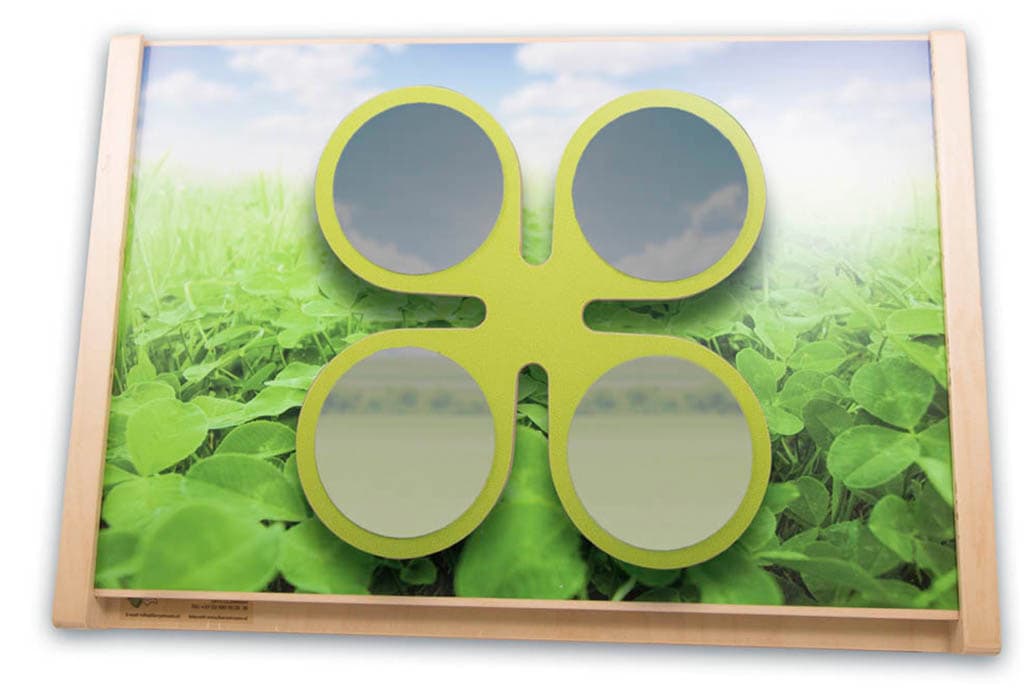 Ein vierblättriges Kleeblatt in einem Meer von Kleeblättern, das sowohl klingelt als auch spiegelt. Ein grundsolider und lustiger Aktivitätsteller. Abmessungen der Aktivitätsplatte: 57,5 x 39,5 cm