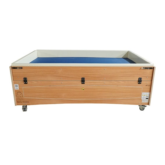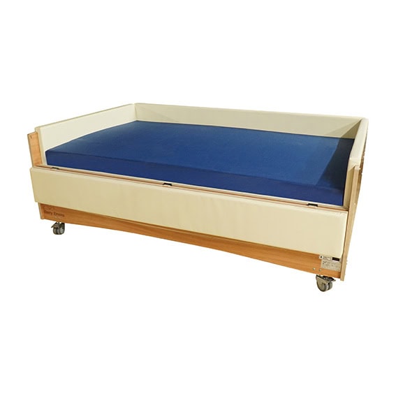 Mobile special bed Paris 120x200cm with surround of 27 cm densely padded in cream front and back flaps complete with basic care mattress. Please note bed is not tilltift lowerable.
