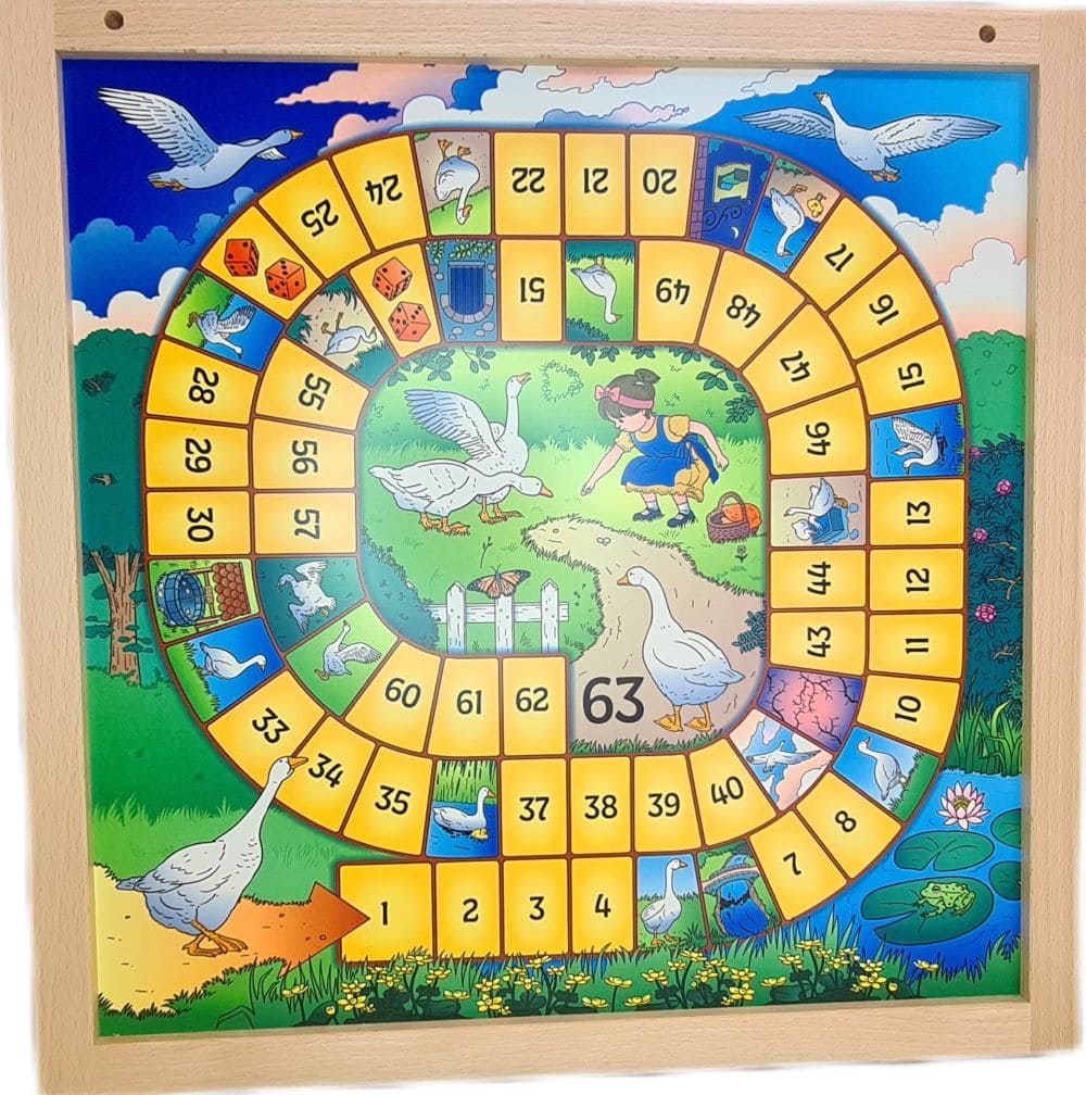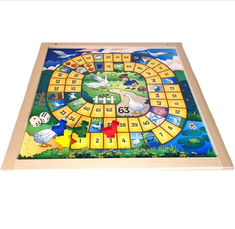 Goose Board XL – Playtime fun at its largest! This magnetic XL version of the classic goose board game provides extra playtime fun. The large 50 x 50 cm board has wooden borders, so that the playing field is clearly visible and clear. At 4.5 cm tall, the wooden geese are nice and handy and easy to grip. And because the board is magnetic, the geese stay firmly in place – no more toppling pawns during the game.
