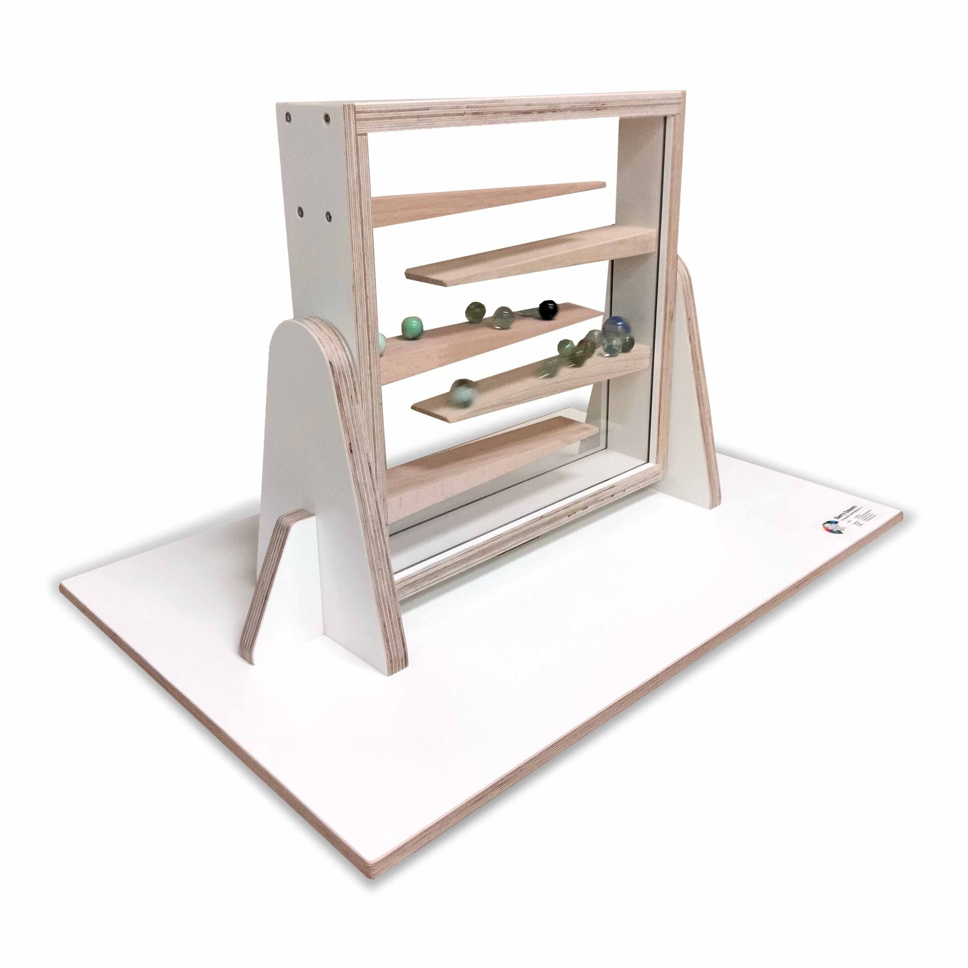 By turning the wooden cabinet one turn, the marbles run from top to bottom. Simple to operate and it provides a visual and acoustic stimulus. The dimensions are: 50 x 50 x36 cm.