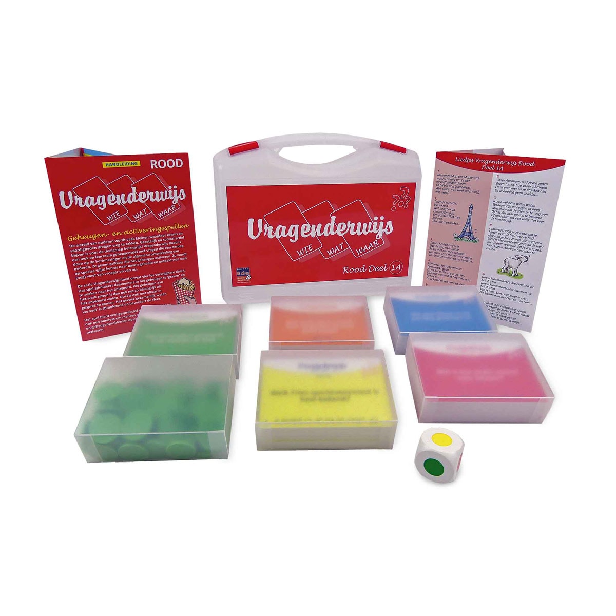 This game is completely renewed and now looks even more beautiful! The series of cases ‘Vragenderwijs’ is well known in the Netherlands! The cases contain sets of cards with questions that stimulate memory. Questioning Red Volume 1A is a memory game with 300 questions on Proverbs, Songs, Language, Nature, and Miscellaneous. The questions are suitable for reasonably vital elderly people and stimulate memory in an enjoyable way. The questions are in large print on the sturdy, professionally laminated cards. Below each question is a tip for finding the answer. On the back is the answer to the question. In the clear manual you will find game forms and information about memory. Chips are used to control the scoring. There is also a song manual with first 4 to 6 lines of each song.