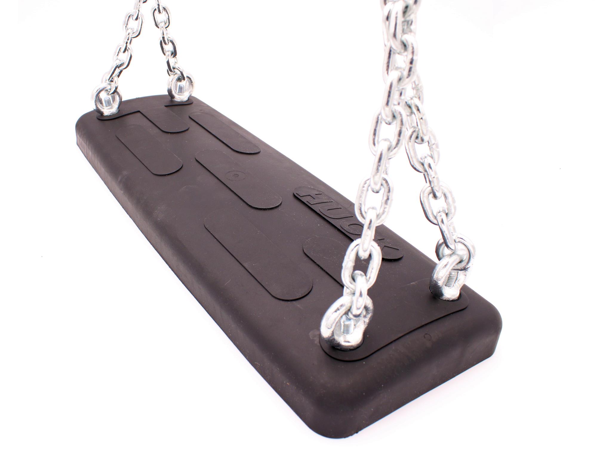 This black swing seat is equipped with 2 stainless steel chains 2.00 m long. Size: 35 x 15 cm, maximum loadable weight 100 kg.