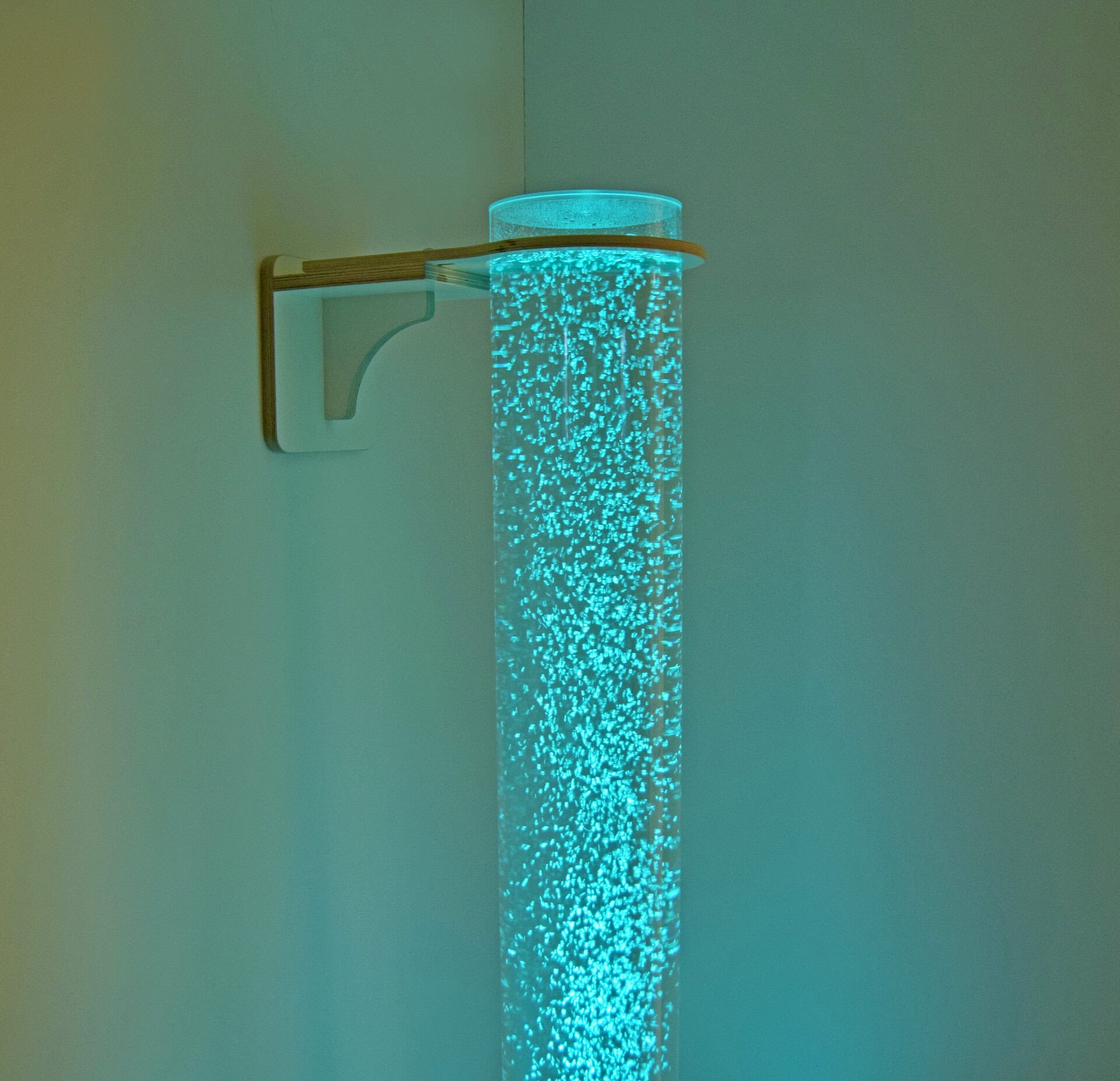 Despite the extremely solid and safe design of the bubble units, we always recommend attaching a wall or ceiling mount to the top of the tube. This tube attachment guarantees optimal safety in situations where the bubble unit is exposed to pulling and pushing. Distance from wall to bubble center: adjustable between 32 – 49 cm. Executed in white wood.