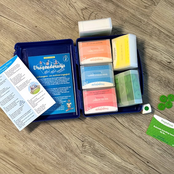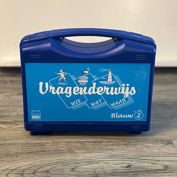 Les valises bleues de la série « Vragenderwijs » sont également connues aux Pays-Bas ! Le jeu de mémoire Vragenderwijs Blue Part 2 Visual offre un outil pour activer les personnes ayant des problèmes de concentration et de mémoire d’une manière agréable. Questioning Blue 2 Visual contient 350 cartes avec des questions réparties en cinq thèmes différents. Les questions sont imprimées en gros caractères sur des cartes robustes et professionnellement plastifiées. Les séries de questions des cas bleus sont beaucoup plus faciles que les questions des cas rouges ! Depuis que la série de valises Blue a été remaniée ces dernières années, les cartes avec les questions contiennent des illustrations (au verso). Cela permet de nouvelles formes de travail, comme l’association sur les dessins. Comme il y a des questions faciles et d’autres plus difficiles, la différenciation est possible. Le questionnaire de la valise bleue est donc également intéressant pour d’autres groupes cibles, tels que les personnes handicapées.