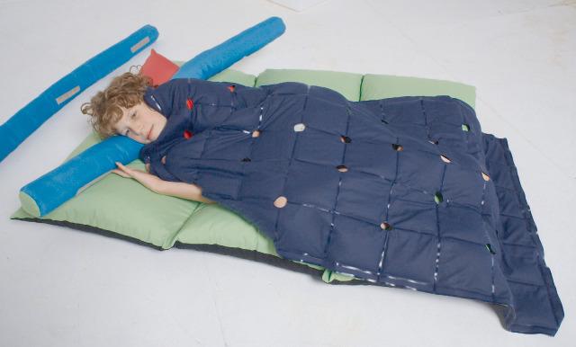 Couverture en forme de boule mesurant 120 x 60 cm et pesant 2 kg. La couverture stimule le système sensoriel et contribue à créer un meilleur bien-être physique. La couverture est efficace grâce au poids des balles, qui stimule à la fois la sensation du toucher (sensibilité superficielle) et la sensation des muscles et des articulations (sensibilité profonde). L’exercice de cette pression renforce la confiance en soi. La couverture a donc un effet calmant. Stimulation par le jeu. Les enfants aiment jouer avec la couverture. Ils peuvent se cacher sous la couverture ou l’enfant peut l’enrouler autour de lui. L’effet stimulant des balles a un effet calmant sur l’enfant et augmente son attention. Une meilleure concentration améliore la motricité et l’apprentissage.