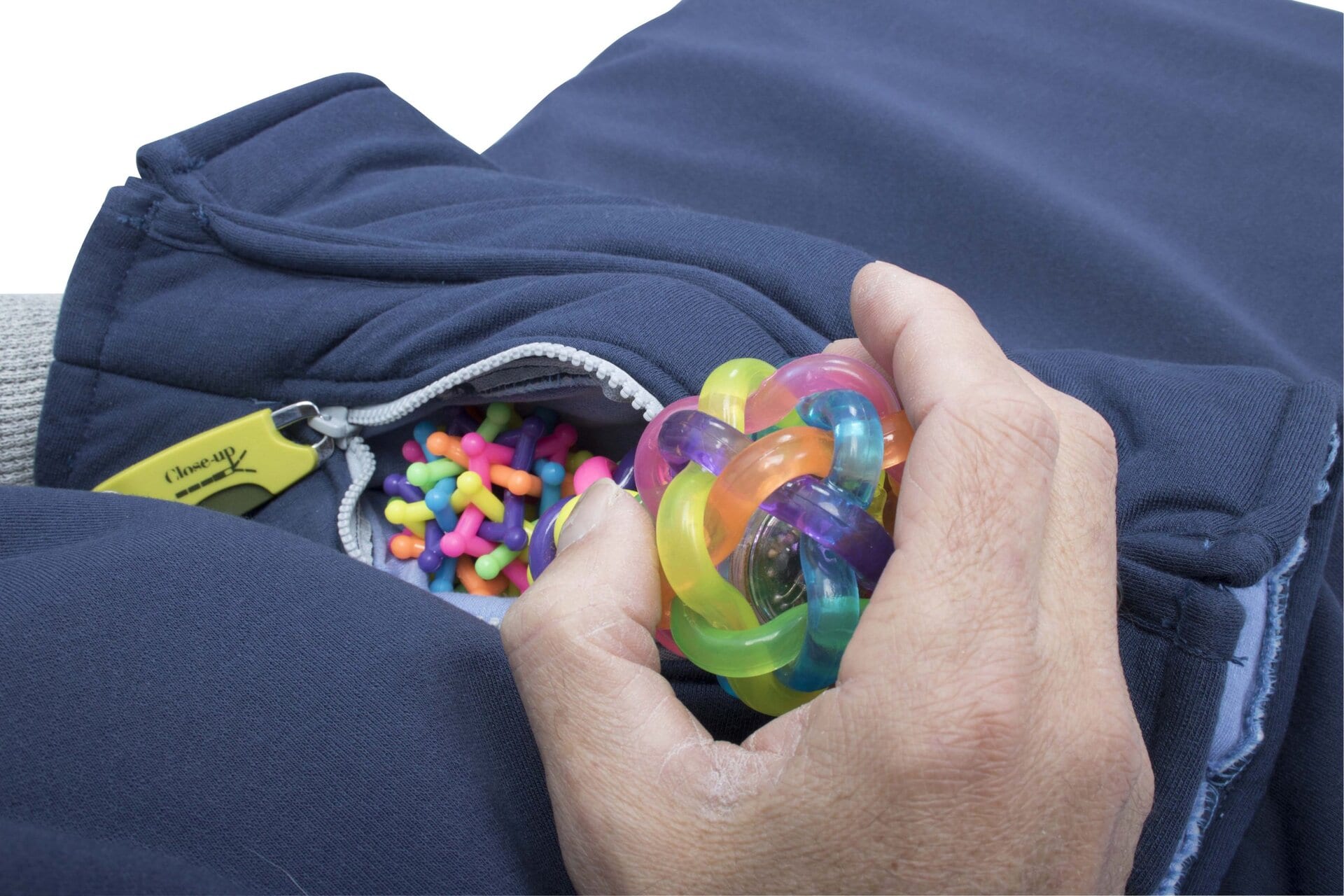 Cette couverture d’expérience de couleur bleue est dotée d’une moufle, d’une ceinture et d’un ruban à boutons-pression à l’intérieur. Le manchon est doté d’une poche tactile intégrée dans laquelle de petits matériaux (tactiles) peuvent être “cachés”. Cette pochette peut être fermée à l’aide d’un fermoir. Si nécessaire, la couverture peut être utilisée avec une couverture d’alourdissement séparée de 3 kg (art. BE05187) ou de 5,5 kg (art. BE05188). La couverture est lavable en machine.