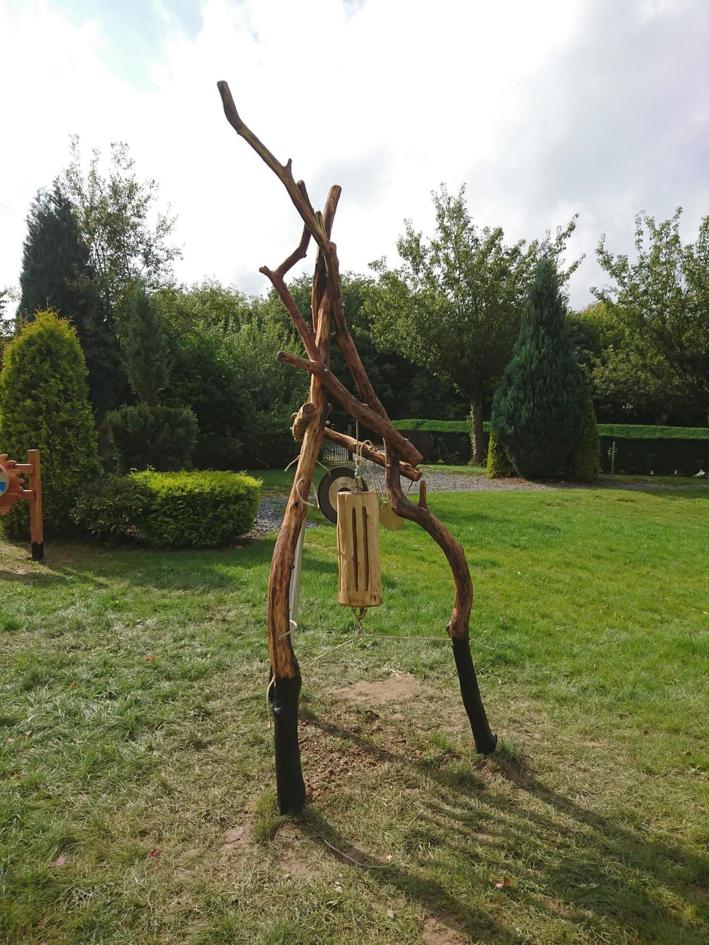 Jeu de troncs de robiniers aux formes magnifiques, entre lesquels sont suspendus divers instruments de musique : 5 tuyaux sonores, 2 gongs et un méga woodblock en bois.