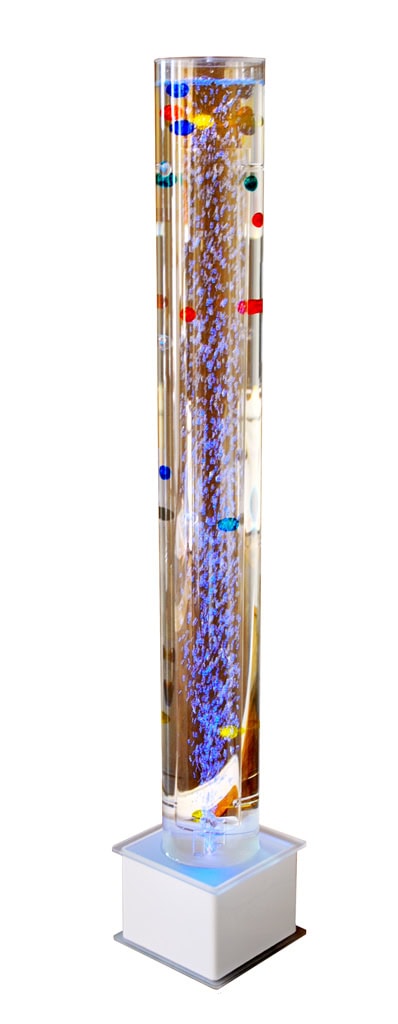 Gekleurde balletjes zweven beurtelings omhoog door de binnenste buis en weer omlaag door de buitenste buis. Samen met de talloze luchtbellen vormt dit een boeiend schouwspel. De kleur van het water en de luchtbelletjes veranderen regelmatig dankzij de ingebouwde LED-verlichting die ook de voet mee verlicht. Hoogte 170 cm, diameter ø 20 cm, buisdikte 5 mm.