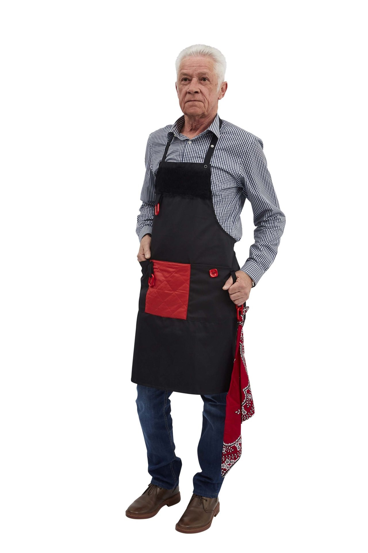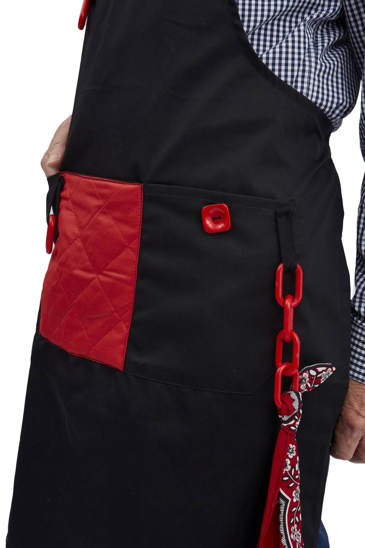 Belevingsschort in de kleur zwart, wasbaar, met regelbaar halslint
