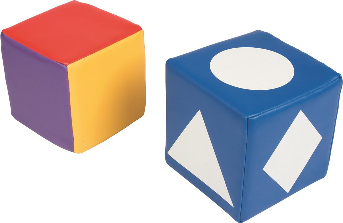 Twee grote dobbelstenen (15 x 15 x 15 cm) om kleuren en vormen mee te leren herkennen. De ene dobbelsteen heeft de drie primaire en de drie secundaire kleuren op de vlakken staan. De ander heeft zes verschillende geometrische figuren. De dobbelstenen kunnen worden gebruikt tijdens de gymles, maar bijvoorbeeld ook in de klas of thuis. Iedere dobbelsteen weegt 250 gram.