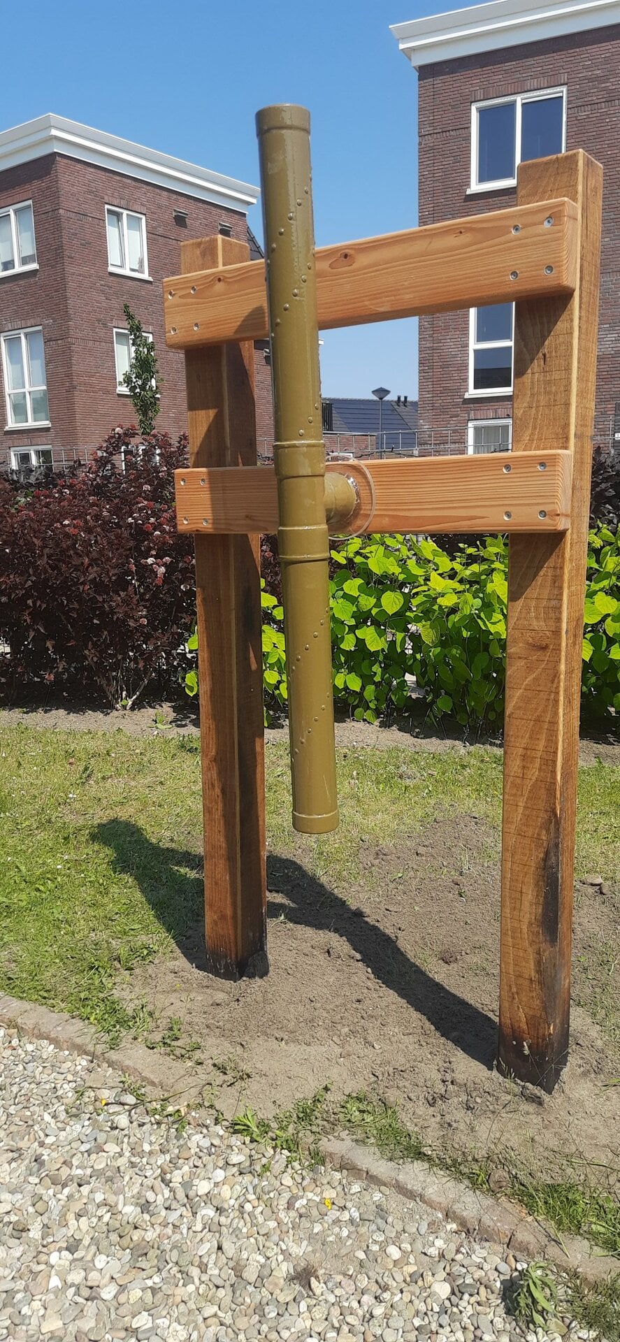 Deze (kunststof) rainmaker op palen is draaibaar en daarmee is het “raineffect” optimaal te beleven.