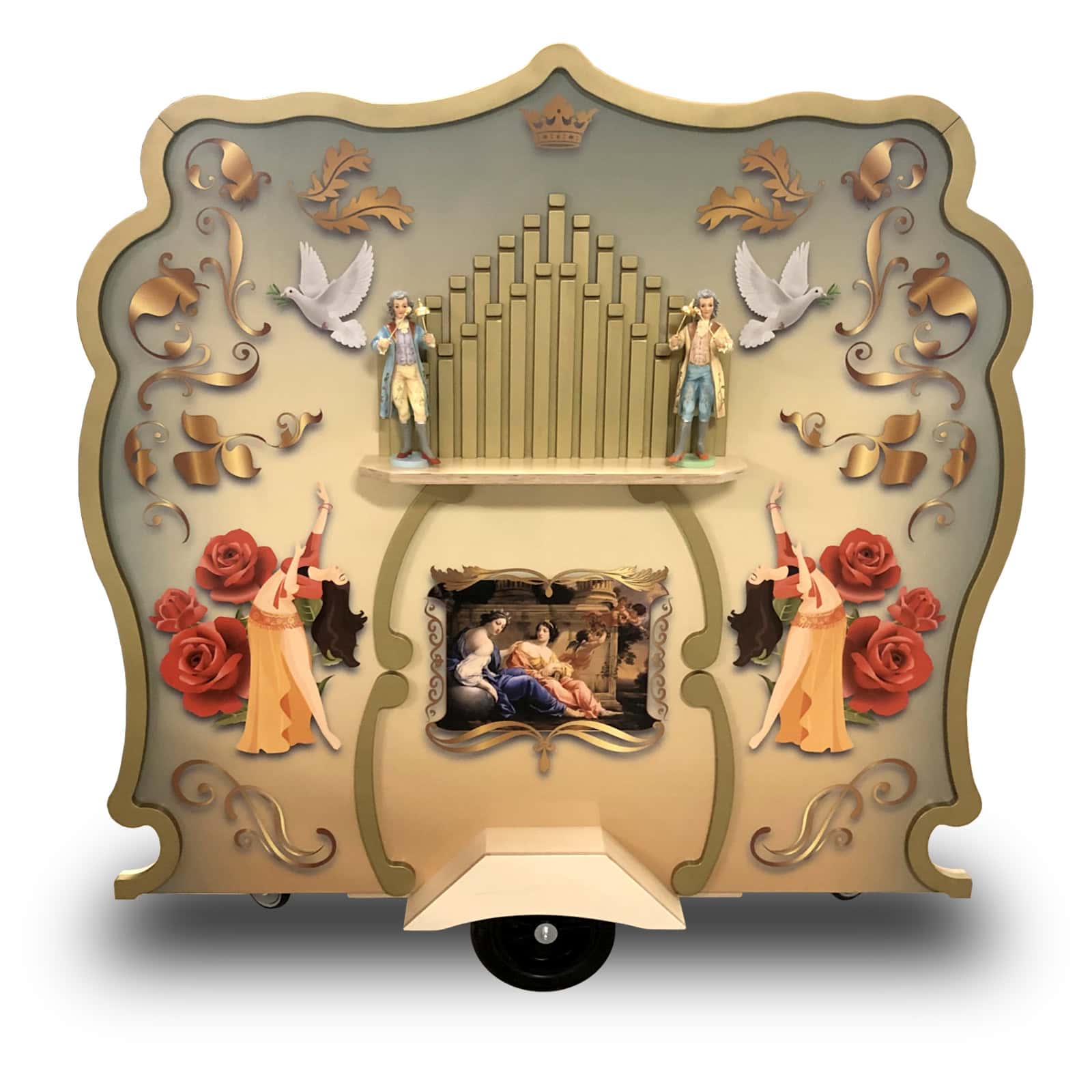 Dit draaiorgel heeft een geprinte en opgelegde zichtzijde die lijkt op de traditionele draaiorgels die we kennen. Intern zit een muziekinstallatie met diverse cd's met draaiorgelmuziek. Het orgel staat op een verrijdbaar plateau, waardoor je het over…