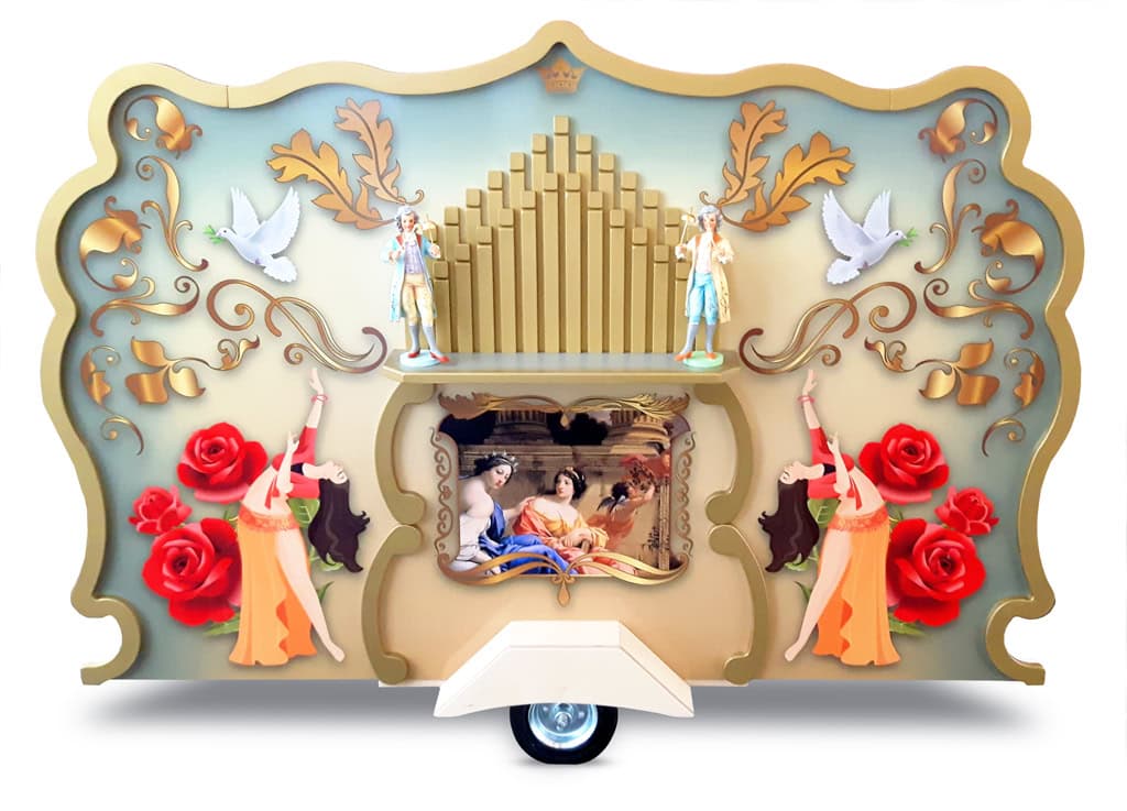 Het orgel is leverbaar in de maten 150 x 140 cm (artikel BE00795) of 180 x 140 cm (artikel BE00797). Er is zelfs een interactieve uitvoering (artikel BE00791), waarbij jij of een bewoner zelf de muziek kunt laten spelen door aan het wiel te draaien. Je kunt dan het tempo zelf bepalen, wat een realistisch beeld geeft van een echt draaiorgel.