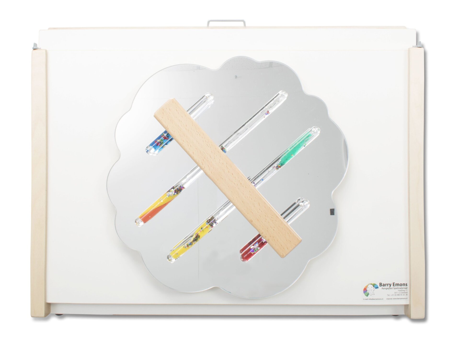 Deze plaat is voorzien van een spiegel-draaischijf met daarop 2 kleine en 2 grote glitterstaven. Door de spiegel te draaien ontstaat in de glitterstaven een prachtig visueel effect! Uitgevoerd in sterk Berken Melamine met een witte toplaag. Afmeting van de acitviteitenplaat: 57,5 x 39,5 cm