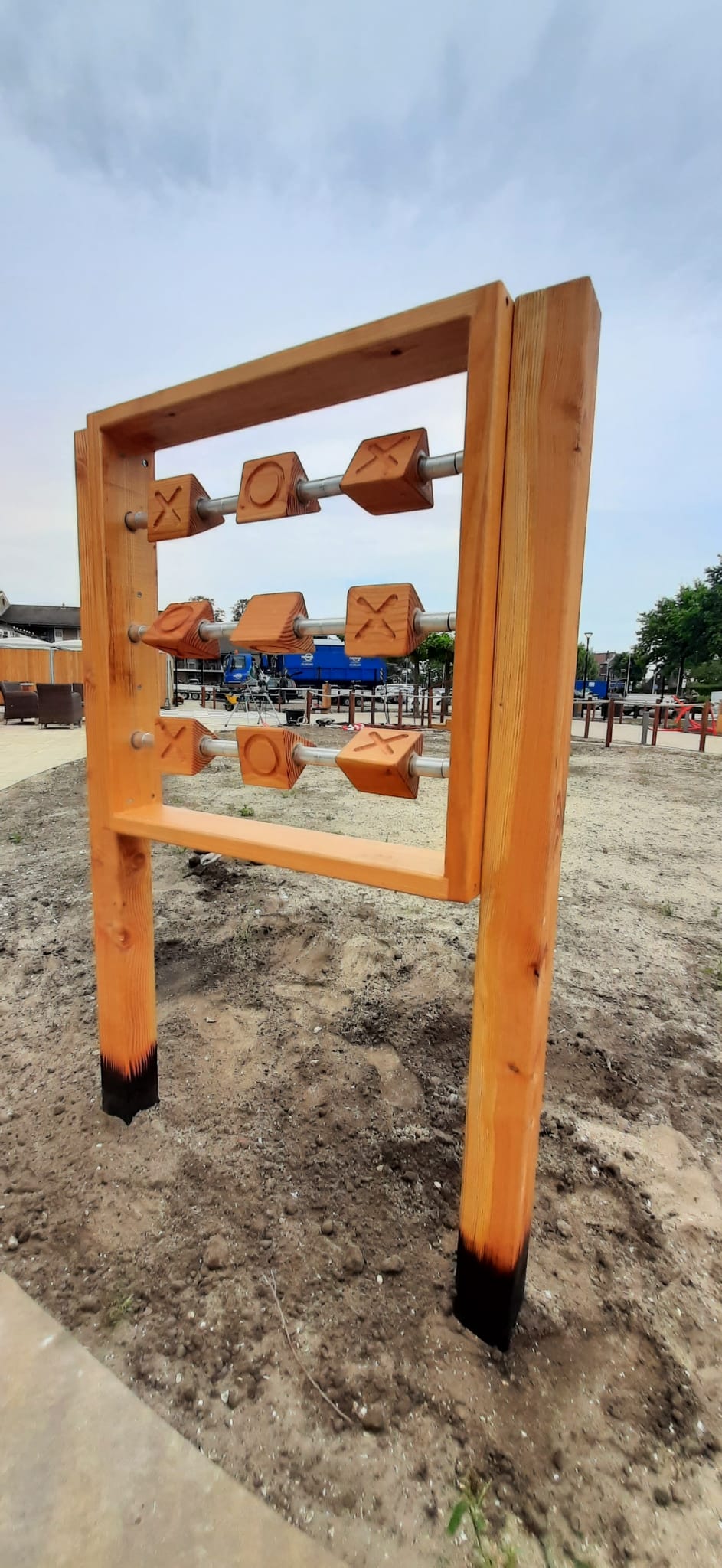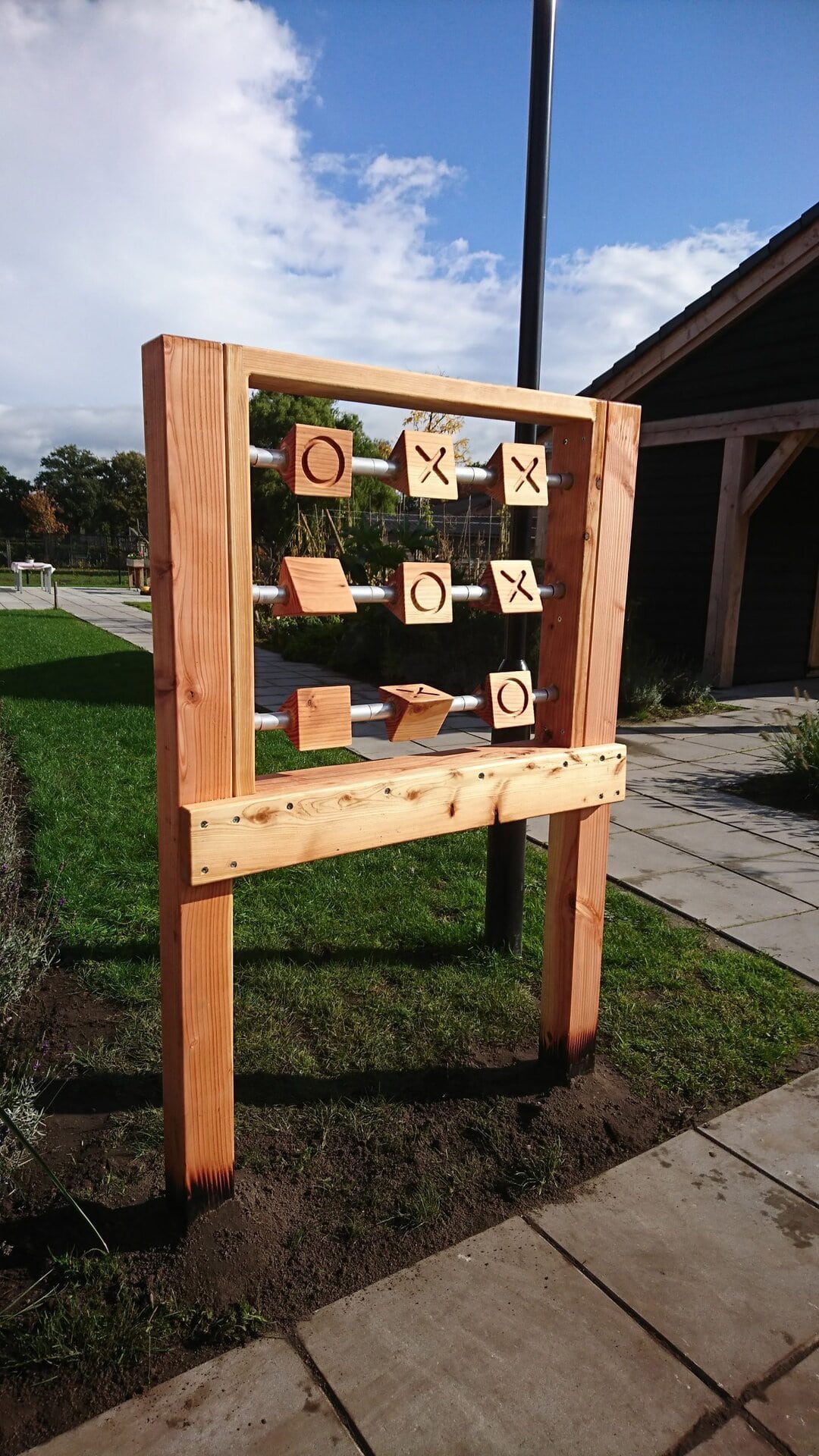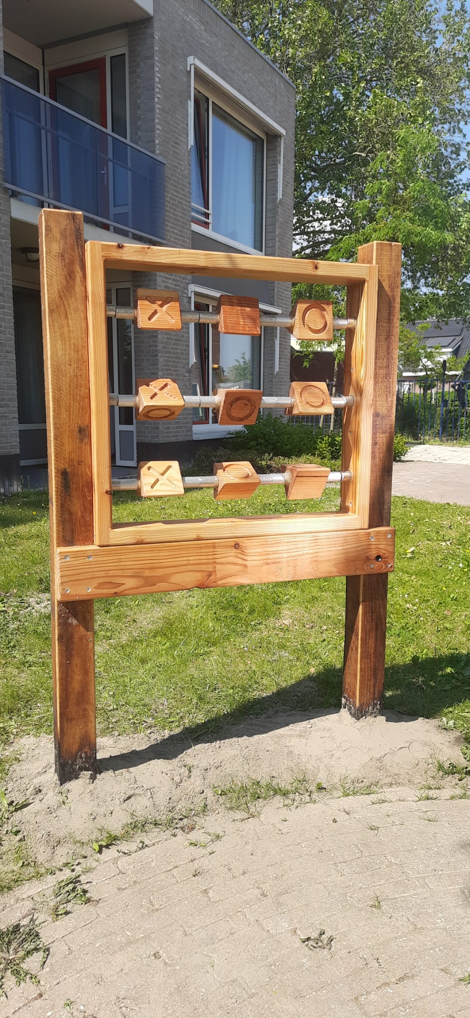 Het blijft een leuk spel; drie-op-een rij! Dit spel is geheel uit Douglas hout vervaardigd en met lijnolie behandeld. Dit spel is van beide zijdes te spelen. De afmeting is 70x70x15 cm. De prijs is inclusief palen, maar exclusief leverings- en pl…