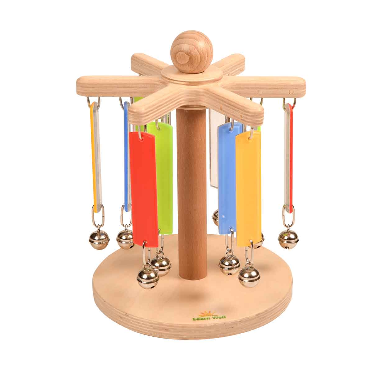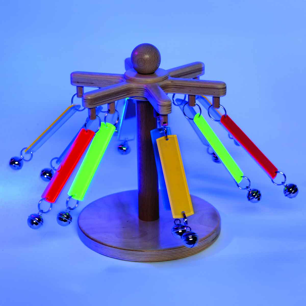 Aan het houten molentje van 20 x 24 cm hangen vrolijk gekleurde spiegelstrips met een belletje. Door het molentje rond te draaien ontstaan aantrekkelijke licht- en kleureffecten, gecombineerd met een vrolijk getinkel van de belletjes.