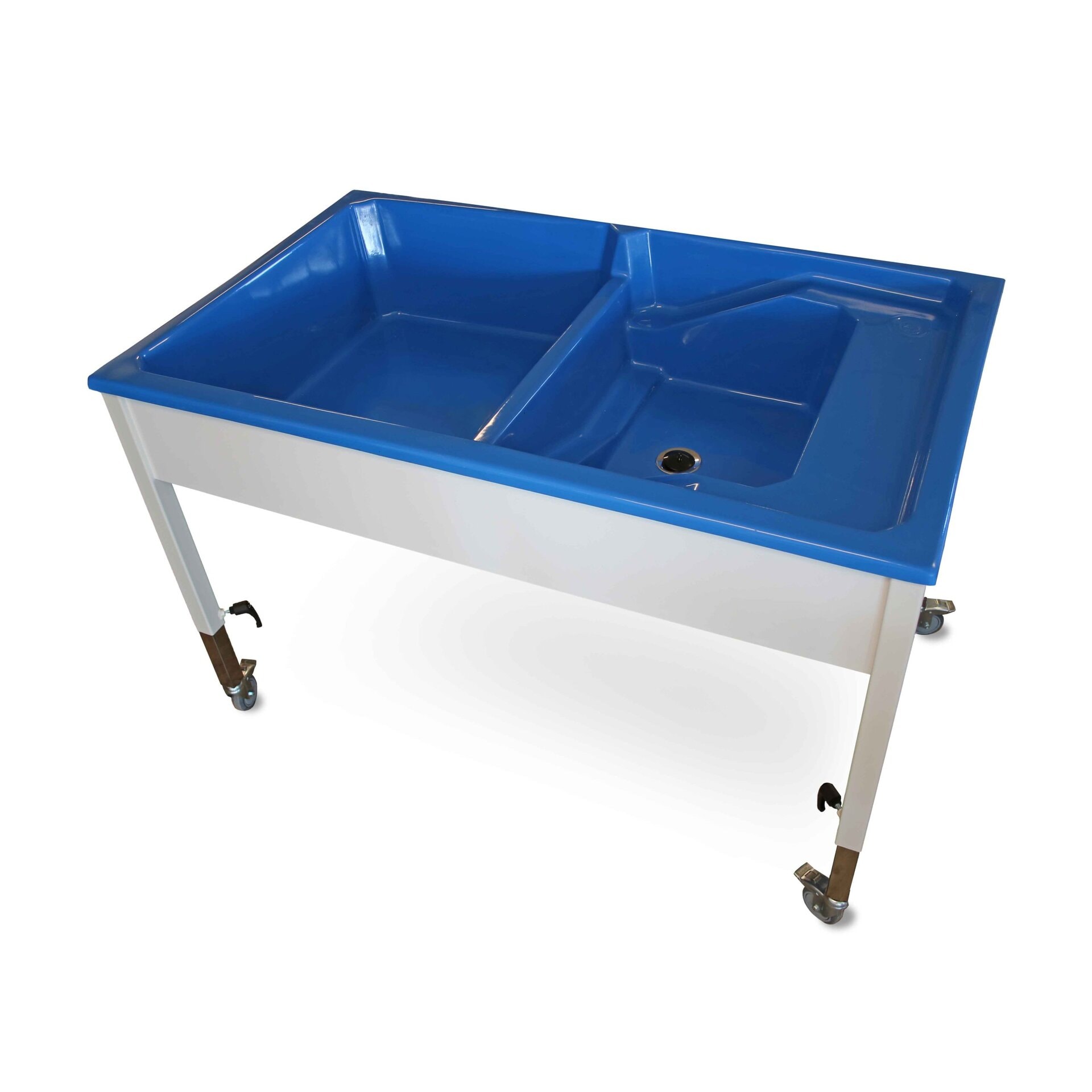 De waterbak is onderverdeeld in twee niveau’s. De maxi zand-watertafel is zeer degelijk uitgevoerd, hoog-laag verstelbaar en daarom goed te gebruiken voor rolstoelrijders. De zijkanten zijn van melamine vervaardigd. Twee dubbelgeremde zwenkwielen behoren tot de standaarduitvoering.