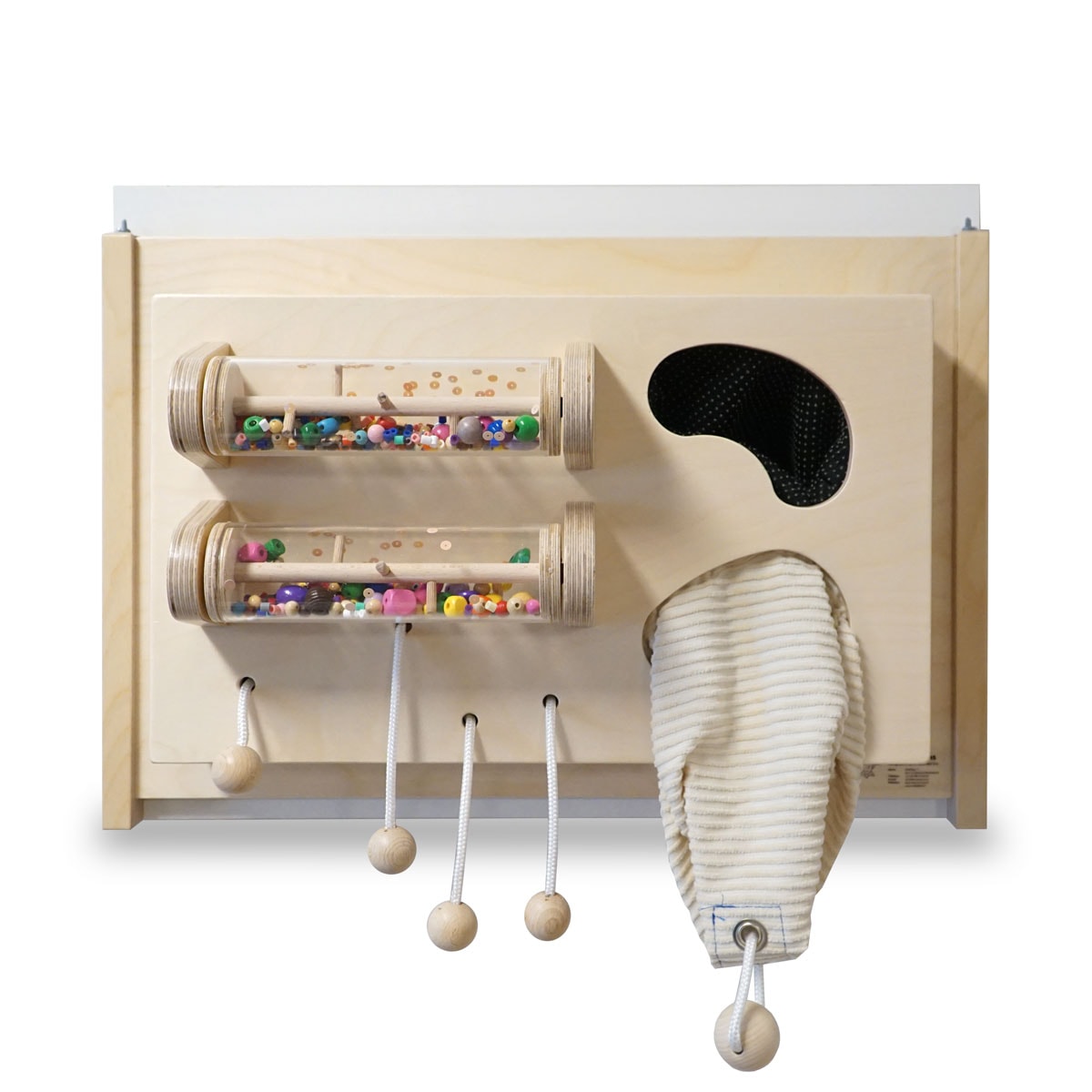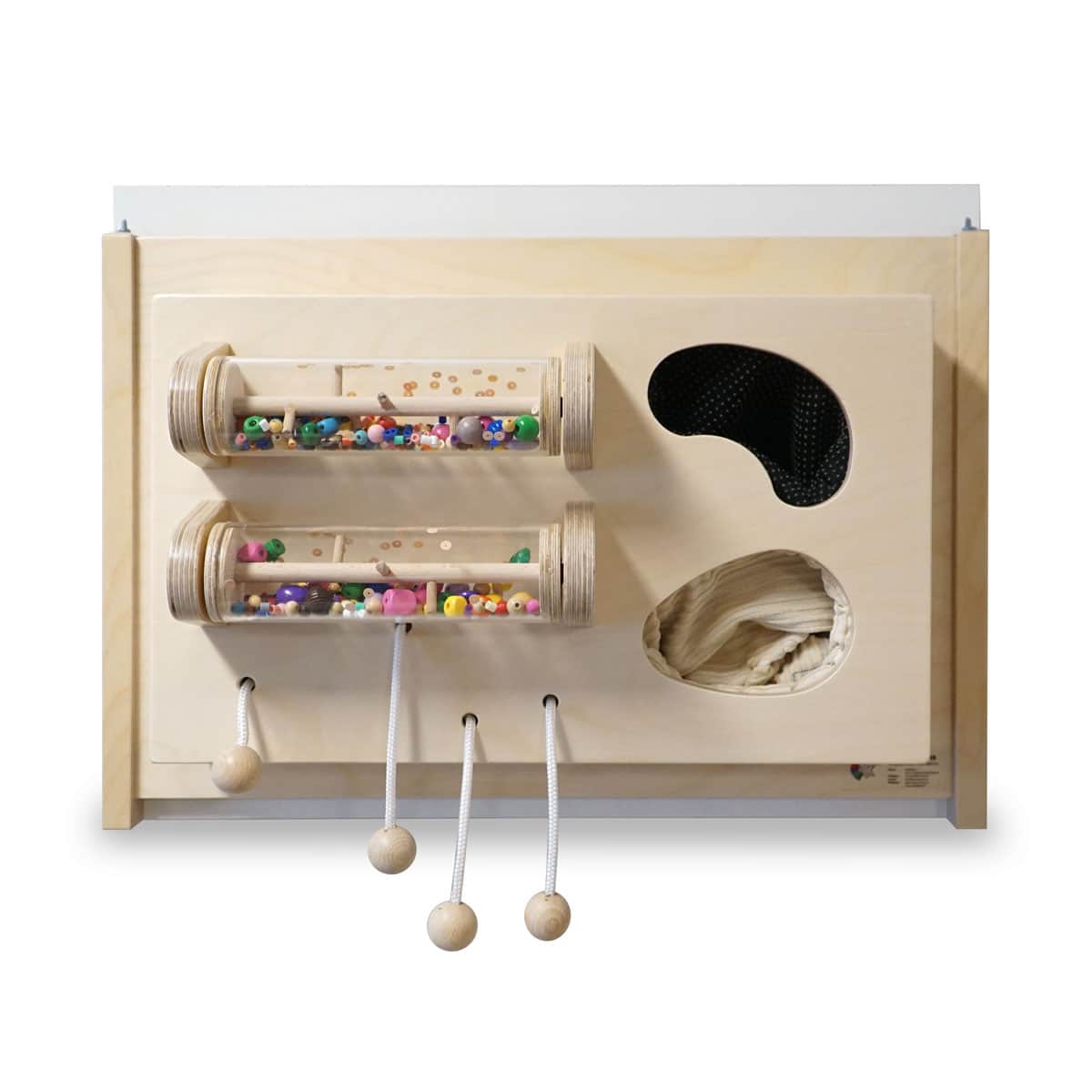 Deze plaat geeft een actie-reactie effect. Door aan onderdelen te trekken, te draaien of te voelen vind je vanzelf een beloning. Naast de tastzin wordt ook het visuele aspect geprikkeld. Tast, kleur, geluid en beweging staan centraal. De spelplaten zijn in het wandinschuifframe te schuiven (apart te bestellen) en daardoor gemakkelijk uitwisselbaar. De frames kunnen aan een muur, maar ook aan een mobiele activiteitentafel geplaatst worden, zodat de spelplaten bijna overal te gebruiken zijn.