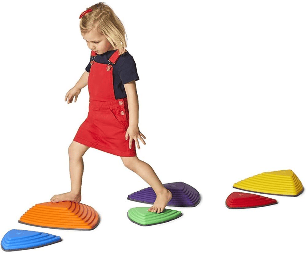 Set van 6 kleurrijke rivier/stapstenen, waarmee vele parcours kunnen worden gemaakt. Elke stapsteen heeft stippen, lijnen of concentrische cirkels op de bovenkant om kinderen sensorische aanraking te bieden. Het antislipmateriaal biedt stabiliteit. Deze set bestaat uit drie verschillende formaten stenen met verschillende hellingen, zodat de stenen gestapeld kunnen worden voor grotere uitdagingen.