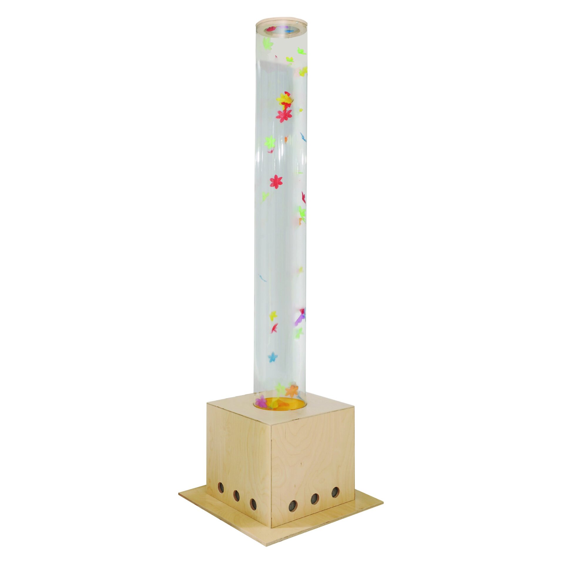 De snoezelbuis is het perfecte alternatief voor de bubbelunit, maar dan zonder water. Vanwege zijn degelijkheid, prijs maar vooral het mooie steeds wisselende schouwspel dat de gekleurde bloemetjes die door de buis wervelen geven. Tevens geven de tussentijdse korte ‘rustpauzes’, waarin de bloemetjes weer naar beneden dwarrelen een bepaalde spanning. De snoezelbuis heeft een hoogte van 193 cm en een doorsnede van 20 cm. De extra brede sokkel van 55 x 55 cm zorgt voor een zeer stabiele basis.