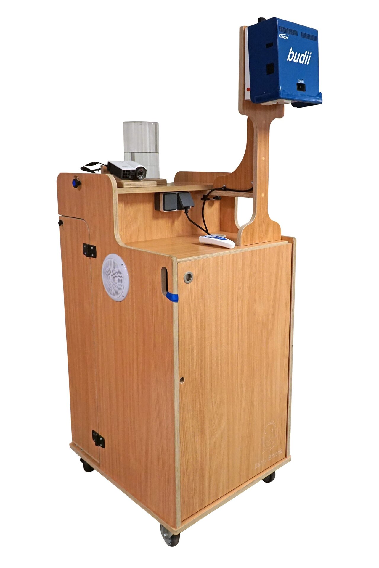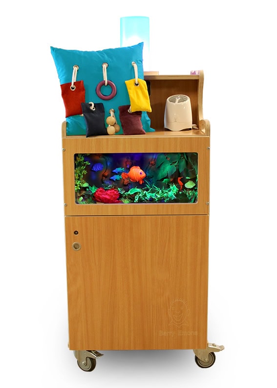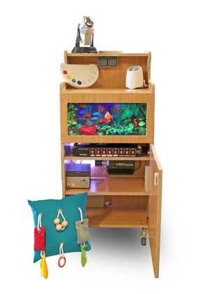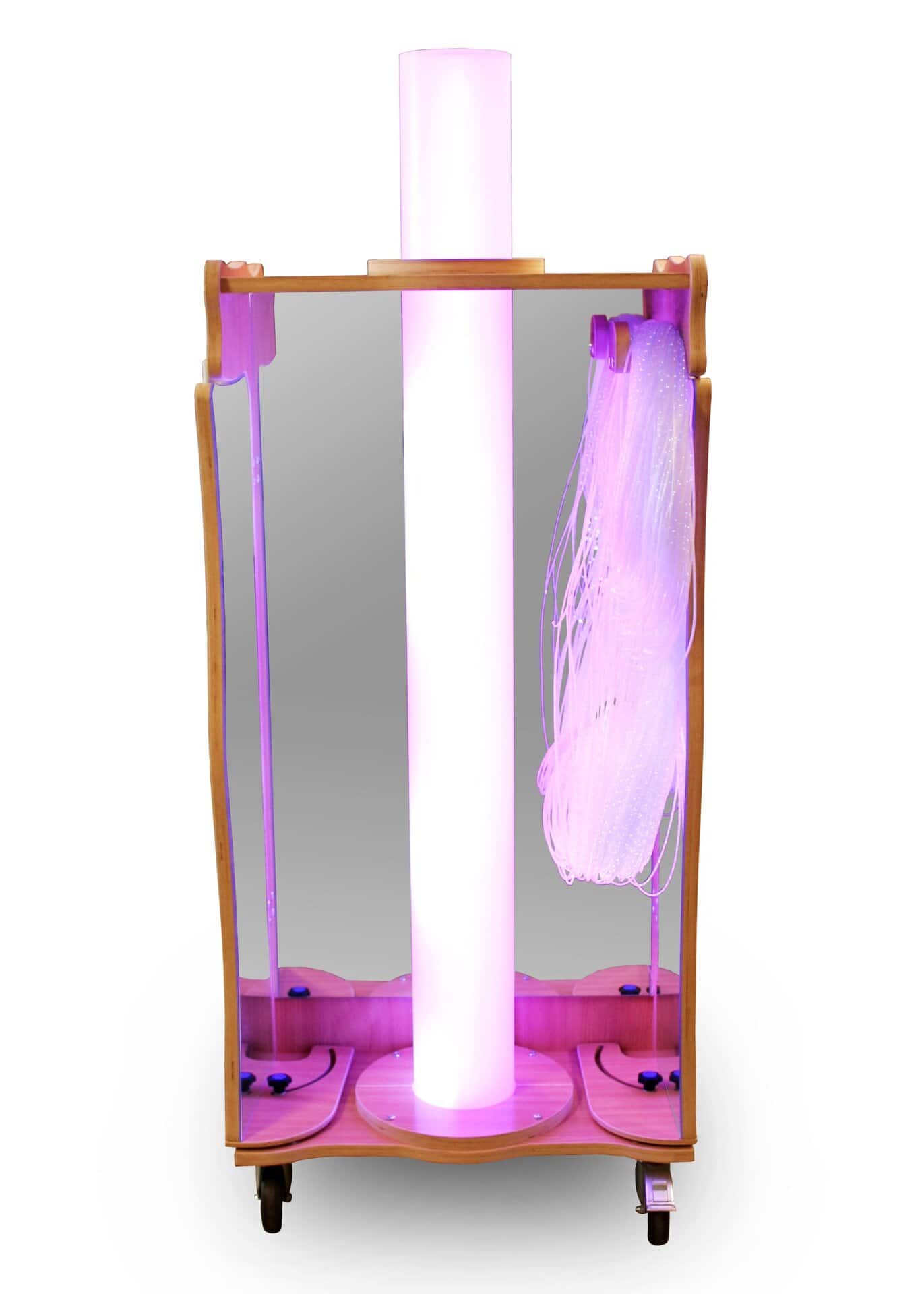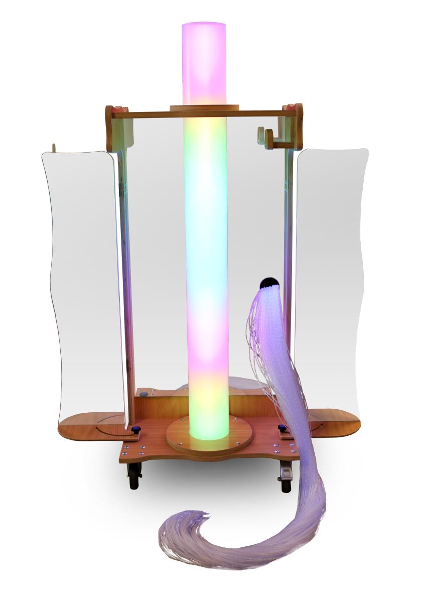 Achter de gematteerde kleurenbuis zijn spiegels geplaatst die een mooi diepte-effect creëren. Ook is de kar voorzien van een muziekinstallatie met ingebouwde luidsprekers en met de meegeleverde powermanager kunnen de afzonderlijke snoezelelementen worden bediend. Aan de achterzijde van de kar is een prachtig blacklight aquarium ingebouwd.
