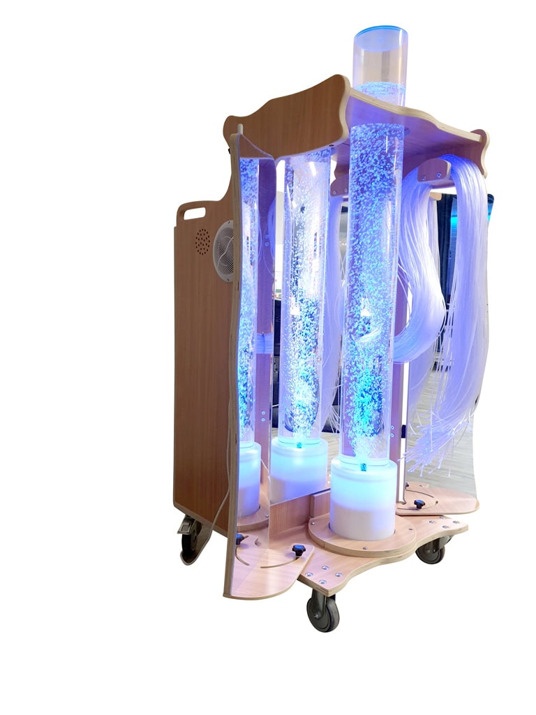 Ons slankste model, Snoezelkar Eric Deluxe is door zijn design erg handzaam in kleinere ruimtes. De ingebouwde bubbelunit komt nog beter tot zijn recht door de uitklapbare zijkanten met slagvaste spiegels.
