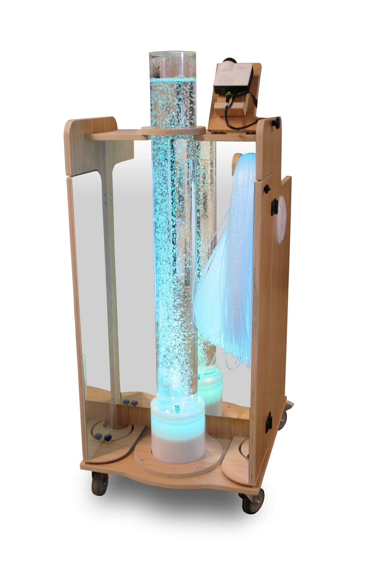 Snoezelkar Miranda is de perfecte mix van de mogelijkheden die onze SensiView en snoezelkar Sophie bieden! Via het gebruiksvriendelijke bedieningspaneel kun je uit 9 verschillende rustgevende standaardthema’s kiezen, maar ook eigen sticks kunnen via de USB-poort worden gebruikt. De beamer, versterker en ingebouwde speakers bieden een goede weergave van projectie en geluid. Doordat de beamer gemonteerd is op een rotatiestandaard, is 360 graden projectie mogelijk. Een mooie bubbelunit is omgeven door spiegels. De bubbelunit is in kleur, programma en snelheid instelbaar.