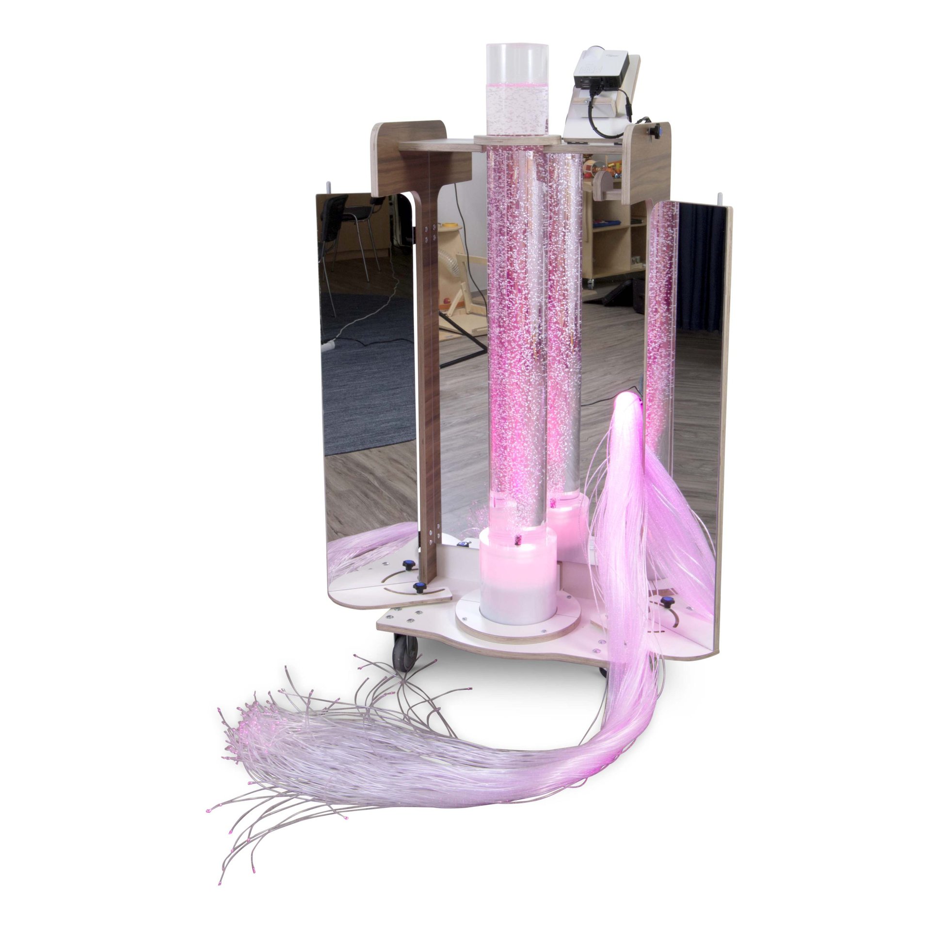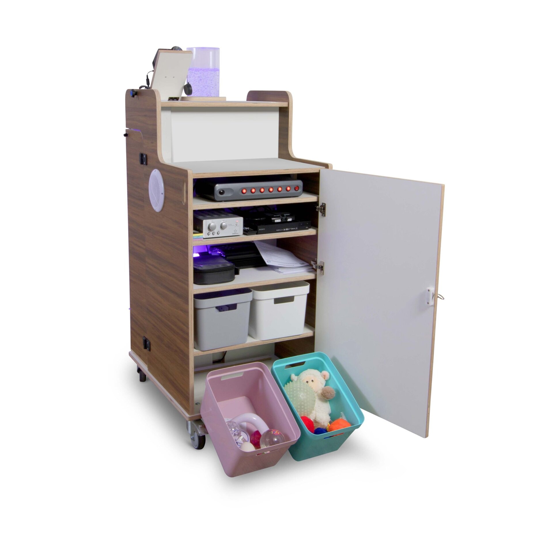 Bubbels, projectie, aroma; alle functionaliteit is geïntegreerd in de Snoezelkar Sophie. De ergonomische kar staat op stevige wielen (3 zwenkwielen en 1 bokwiel) en is overal te gebruiken. Hij is voorzien van diverse elementen die zintuigen kunnen prikkelen; muziek, beeld en de bubble-unit