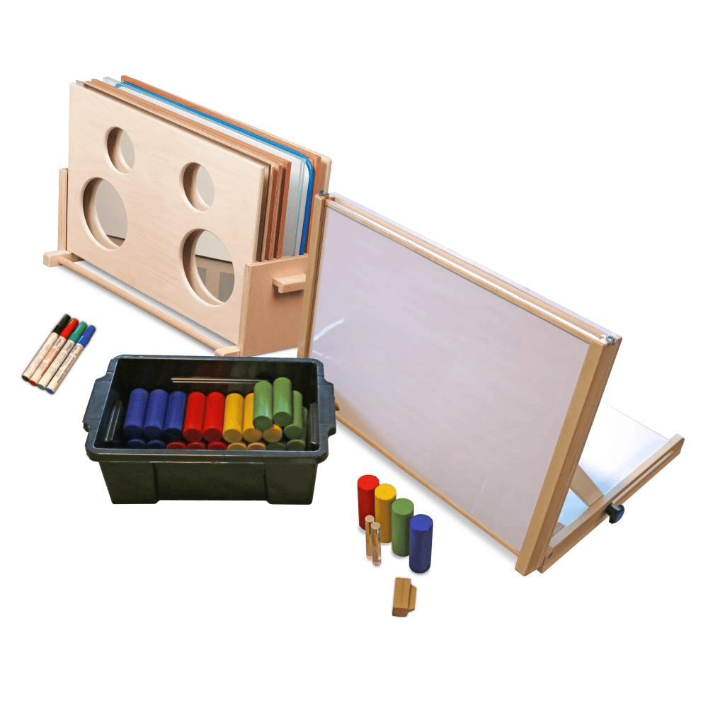 Het complete speel- leersysteem omvat: - een robuust raamwerk van beukenhout, probleemloos verstelbaar van horizontale tot verticale stand - een set van negen in het raamwerk inschuifbare speelleerplaten - een opbergstandaard voor de speel- leerpl…