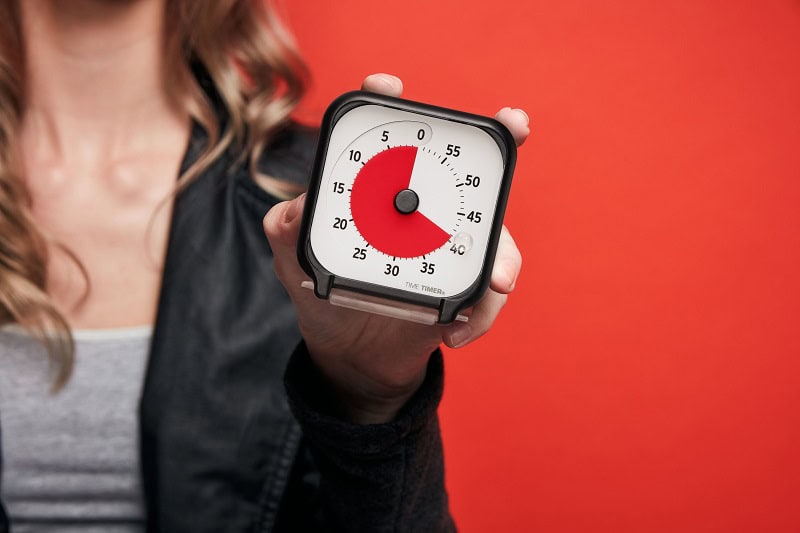 Verstreken tijd is een abstract begrip, soms moeilijk te begrijpen en soms nog moeilijker te beheren. De rode schijf op de Time Timer maakt aanschouwelijk hoeveel tijd er is verstreken en hoeveel tijd er nog over is en helpt daardoor om de beschikbare tijd efficiënt te gebruiken. De rode schijf wordt tegen de klok in ingesteld op de gewenste tijd. Deze rode schijf verdwijnt naarmate de tijd verstrijkt, totdat ze geheel verdwenen is. Aan de achterkant van de Time Timer kan ook een eindsignaal worden aan- of uitgezet, met een subtiel, maar duidelijk piepgeluid dat aangeeft wanneer de tijd verstreken is. De Time Timer werkt op een AA-batterij. Een voorzichtige behandeling verlengt de levensduur van de Time Timer. Leverbaar in drie afmetingen: Large 30 x 30 cm, Medium 18 x 18 cm en Pocket 7,5 x 8 cm. De maten Large en Medium hebben pootjes aan de achterkant waarmee ze kunnen staan, of ze kunnen worden opgehangen. De Pocket heeft een beschermende deksel, die fungeert als standaard wanneer hij opengeklapt is.