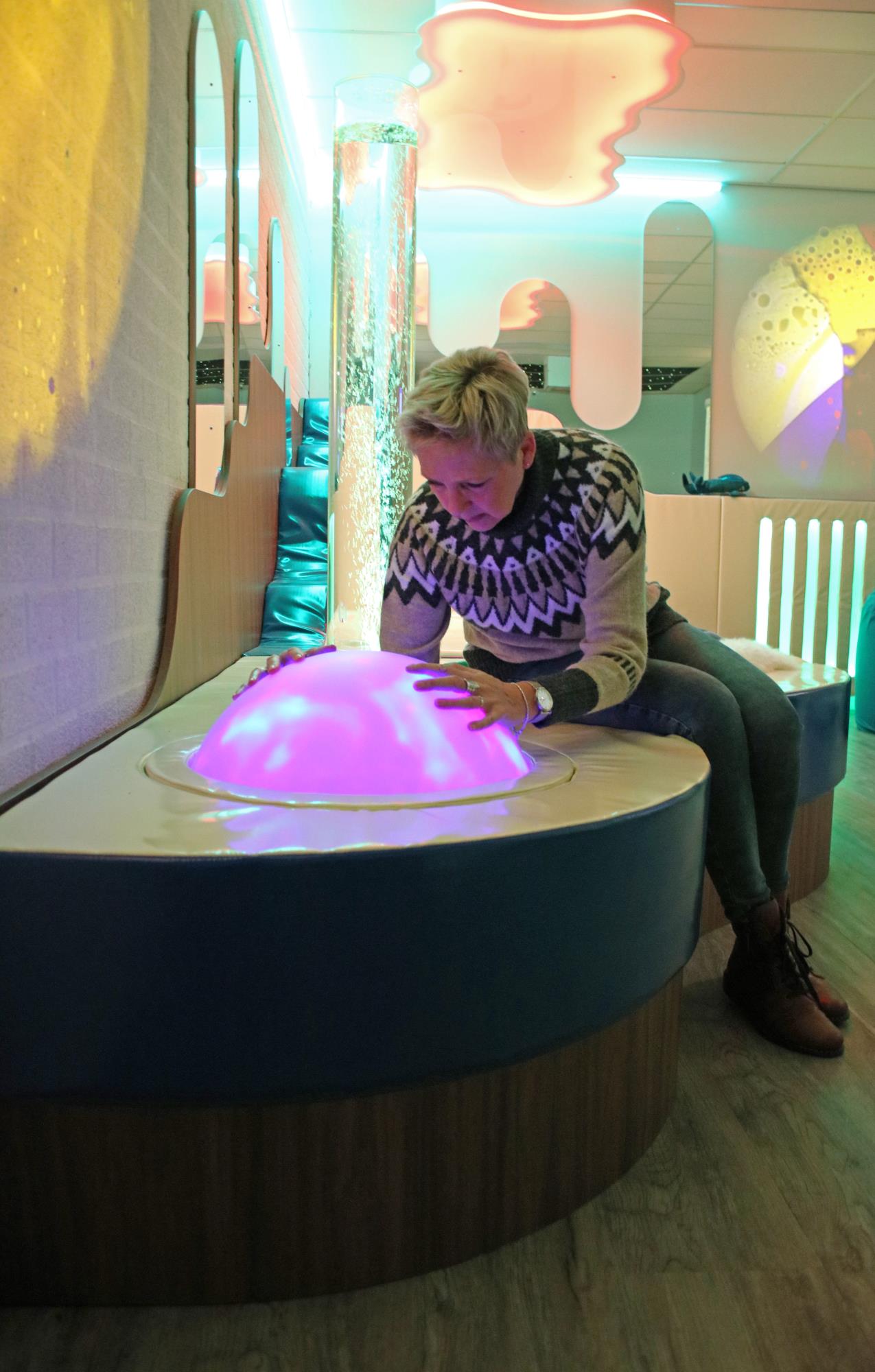 De toverbol is een schitterend kijkobject dat het best te vergelijken is met een soort geconcentreerde vloeistofprojectie binnenin de bol. Je ziet werkelijk prachtige kleureffecten die via een geruisloos draaiende motor een constant wisselend schouwspel geven in de maar liefst 50 cm grote bol. Vooral wanneer de ruimte enigszins verduisterd is zal de toverbol het best tot zijn recht komen en een centraal aantrekkingspunt vormen, zeker voor diegenen met een beperkte visus. De toverbol staat op een stevige kunststof voet en is extreem degelijk uitgevoerd.