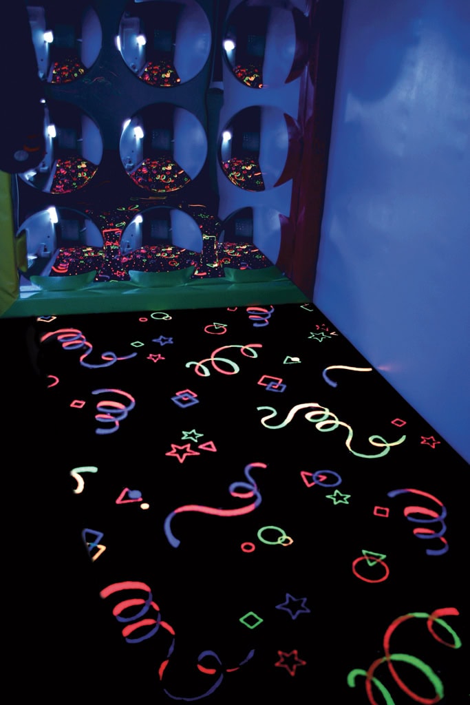 Een prachtig fijn geweven tapijt van gekleurde, fluorescerende draden. Ideaal voor een speciale snoezelruimte en daarbij extra interessant voor mensen met visuele beperking. Het tapijt is zacht aan de handen en voeten en slijtvast. Afmeting 2 x 1 meter.
