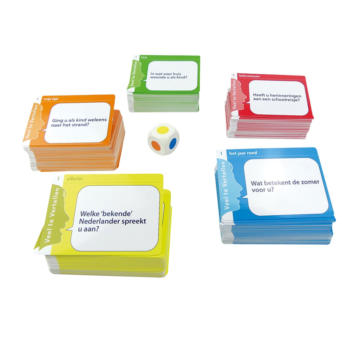 Dit spel is eind 2017 vernieuwd: de spelkaarten zijn groter en mooier vormgegegeven met afgeronde hoeken. Professioneel gelamineerd zitten ze verpakt in een kunststof doosje. De handleiding is ook uitgebreid. De koffer bevat vijf sets van 60 vragen, in totaal dus 300 vragen. Elk van de vijf thema’s heeft zijn eigen kleur. Gekozen is voor open vragen, waarbij de persoonlijke ervaring voorop staat. Daardoor is er niets fout, zijn alle antwoorden goed. Dat is een wezenlijk verschil met andere spellen. De vragen nodigen uit om veel te vertellen: over de schoonmaak, seizoenen, liefhebberijen, het weer, feestdagen. Enkele voorbeelden: Van welke muziek hou je? Welke sieraden vindt je mooi? Ben je ergens voor aan het sparen? Bent je wel eens naar een museum geweest? Veel te Vertellen is een leuke manier om aandacht te besteden aan gebeurtenissen van alledag en is geschikt voor (bijna) alle volwassenen.