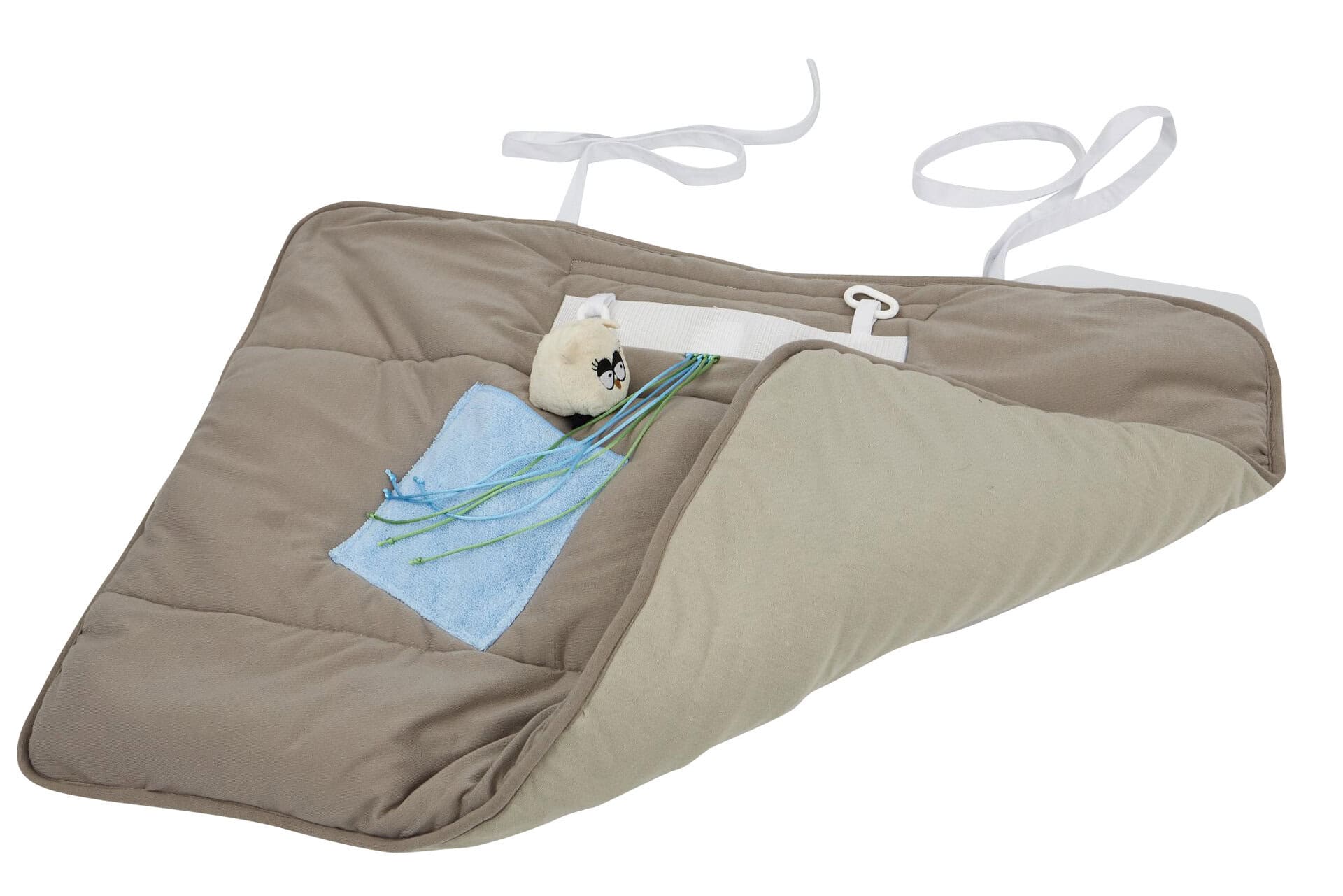 Belevingsschootdeken, in kwal. 1010, wasbaar, met ceintuur, ingenaaide ballen, belletjes en knopen, ring om iets persoonlijks aan te hangen.