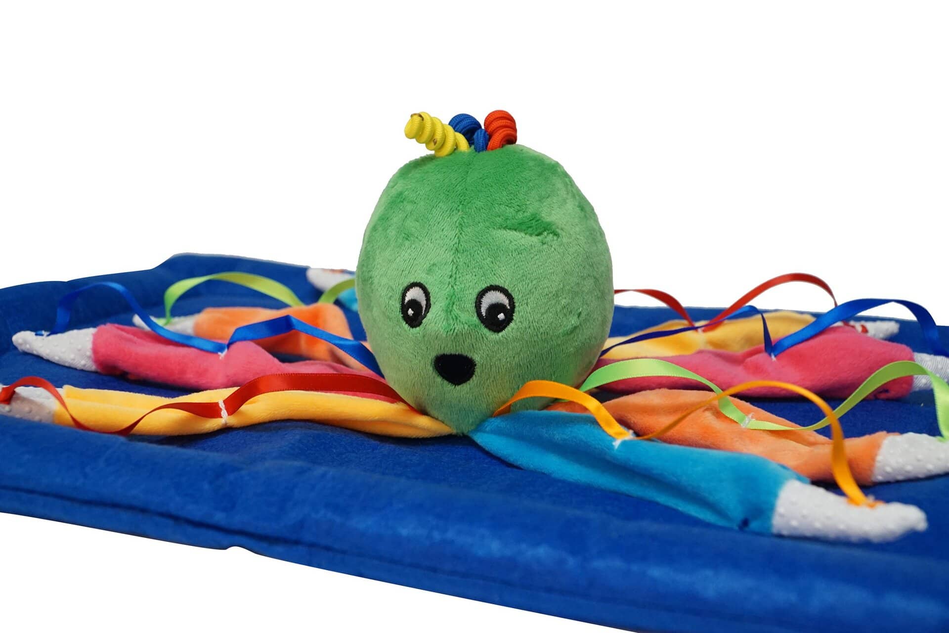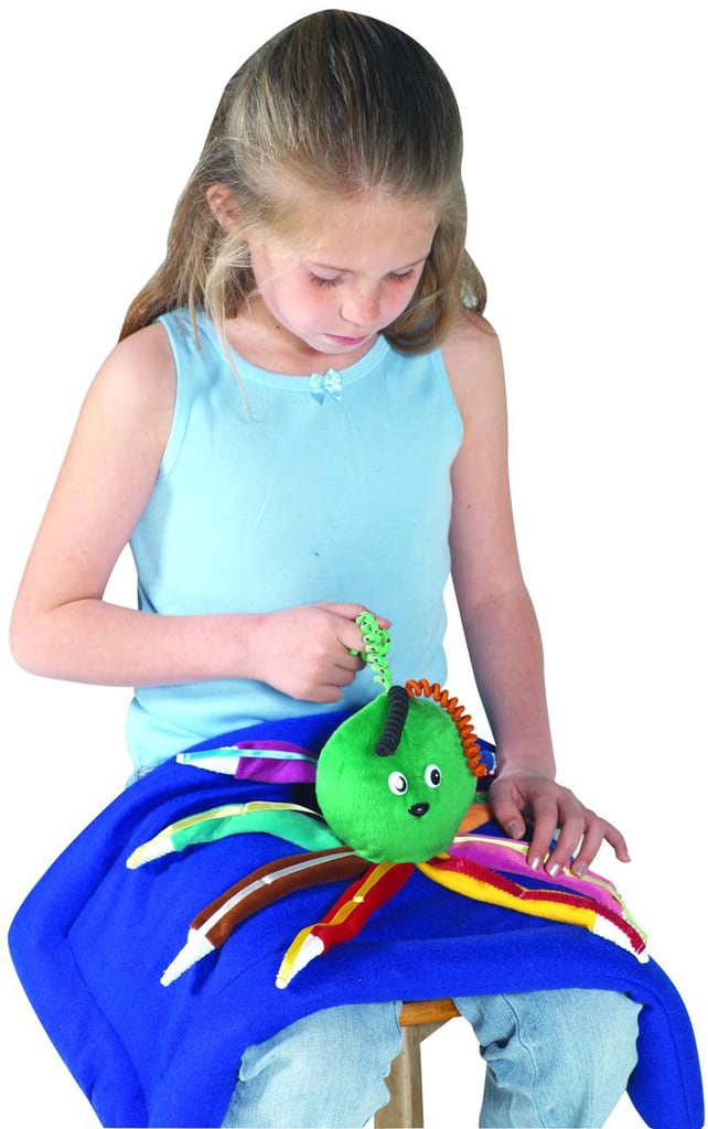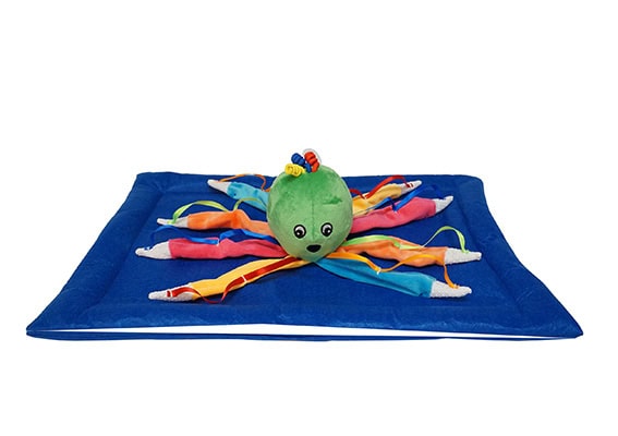 Deze zachte vilten tastoctopus zit vast op een verzwaard kussen, dat je lekker op schoot kunt leggen. Heerlijk om te aaien en te knuffelen en wanneer je aan het plastic ringetje aan de achterkant trekt, begint hij te trillen. Afm. 34 x 60 cm, gewicht 750 gram. Reinigen met een vochtige doek.