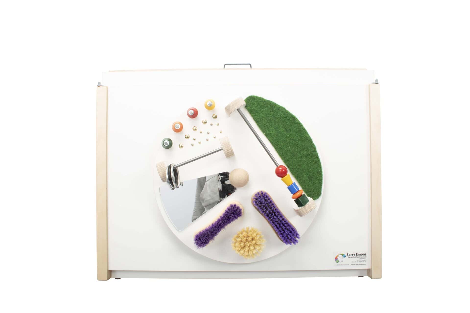 Op deze speelplaat met schijf zijn allerlei verschillende voelelementen te vinden. Dat de schijf kan draaien maakt het extra spannend. De kralen en de ringen op de staafjes zijn met de hand bespeelbaar, maar ook door het draaien van de schijf in beweging te zetten. De voelschijf heeft een doorsnede van 35 cm en is uitgevoerd in Berken Melamine wit. Afmeting van de acitviteitenplaat: 57,5 x 39,5 cm