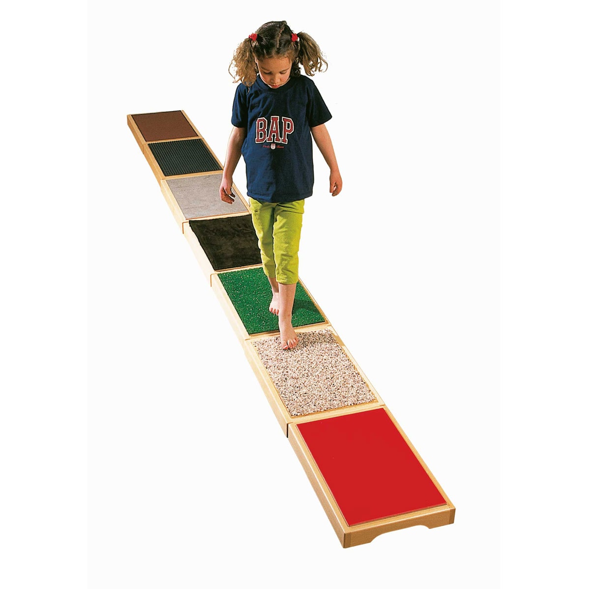 Een prachtig afgewerkte set om een parcours op te stellen dat blootsvoets bewandeld en betast moet worden. De complete set van zeven op elkaar gestapelde tastborden is bovendien verrijdbaar. Afmeting: 53 x 35 x 6 cm.