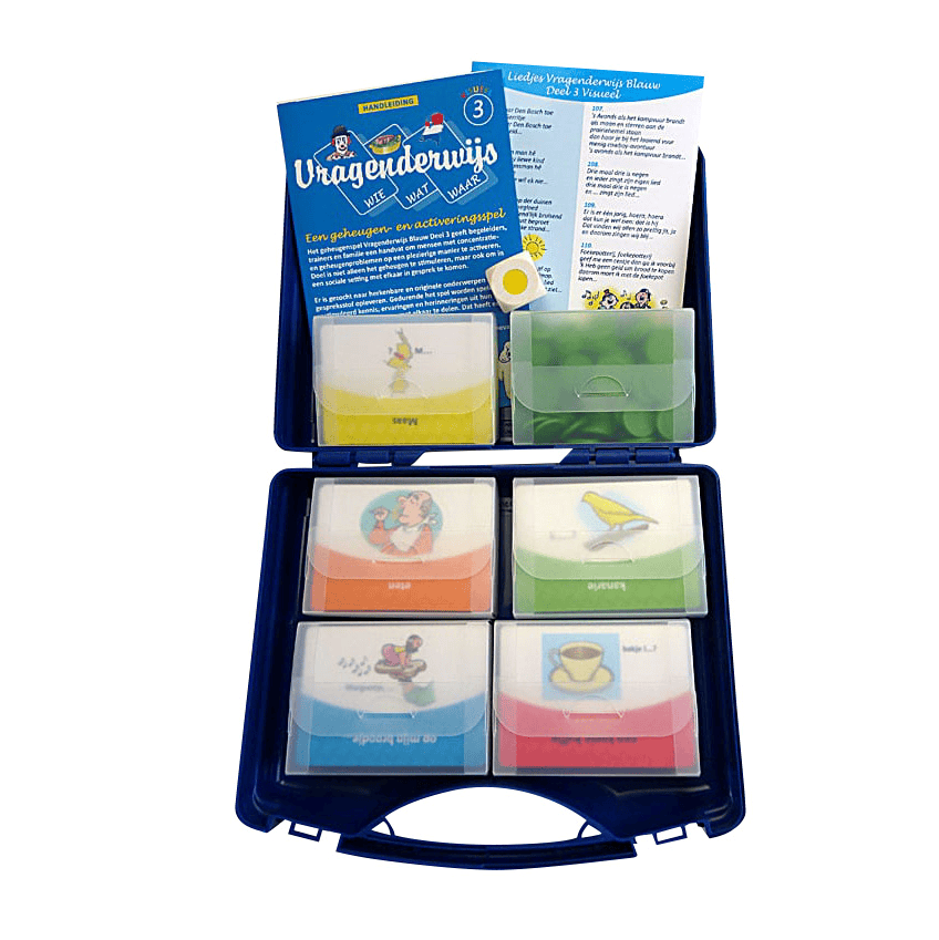 Vragenderwijs Blauw deel 3 is een zeer populair activerings- en geheugenspel. Het is totaal vernieuwd, zoals eerder Deel 2 is aangepast. Het koffertje bevat nu 350 (ipv 250) kaarten met eenvoudige vragen over spreekwoorden, liedjes, taal, natuur en andere onderwerpen. De vragen zijn per categorie verpakt in een mooi kunststof doosje en iedere kaart heeft een illustratie die is afgestemd op de vraag en het antwoord. Het spel heeft een vernieuwde handleiding en een nieuwe liedjeshandleiding. Het is niet noodzakelijk Deel 2 aan te schaffen om Deel 3 te kunnen gebruiken.