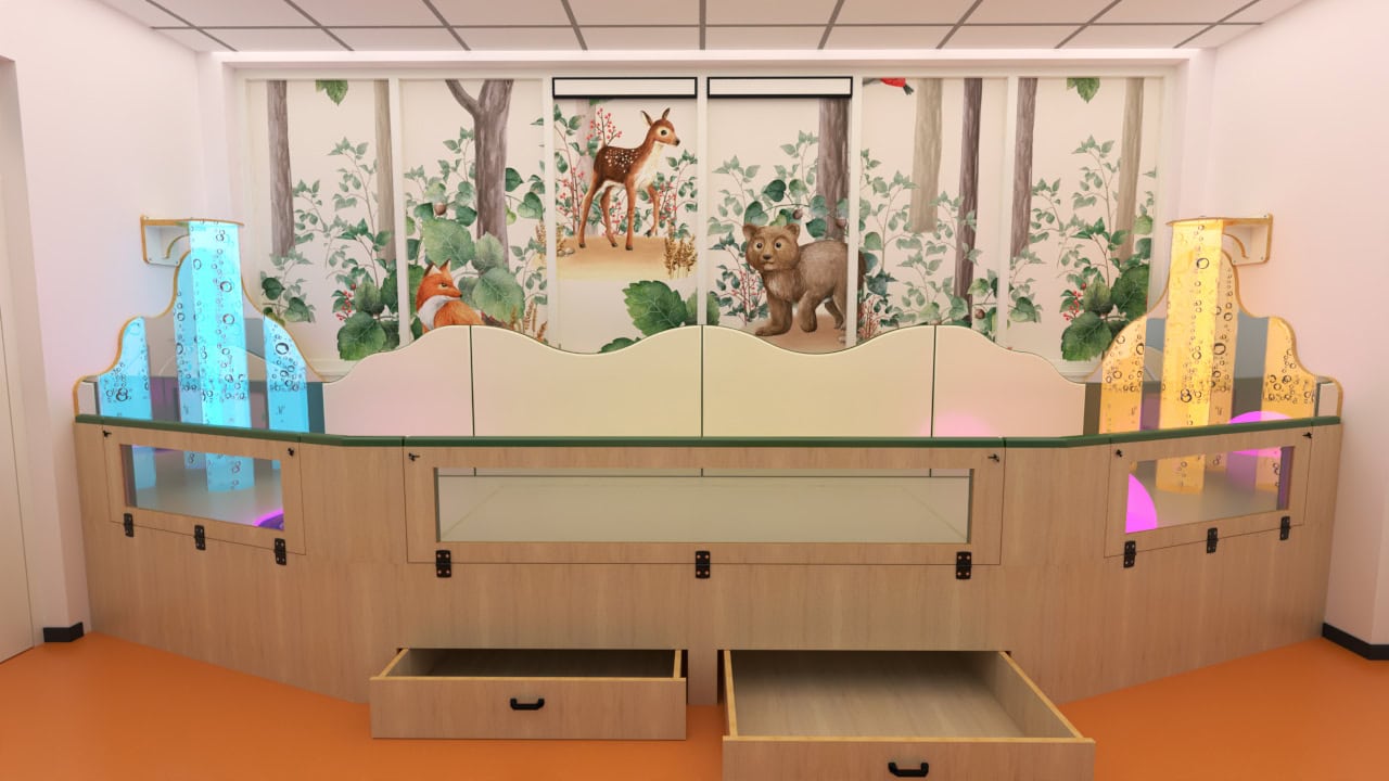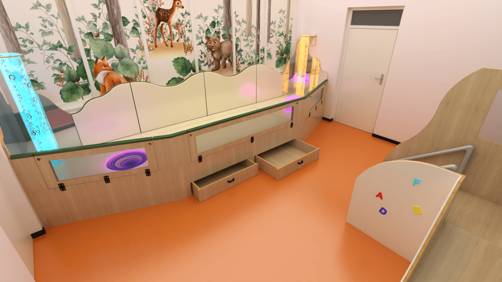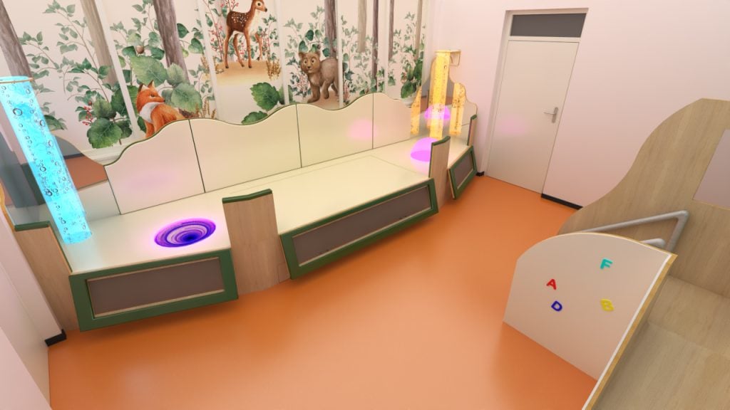 Deze snoezelruimte is ontwikkeld voor een therapeutische peutergroep. Door de hoge omranding in combinatie met polstering, kunnen de kinderen veilig spelen en snoezelen.