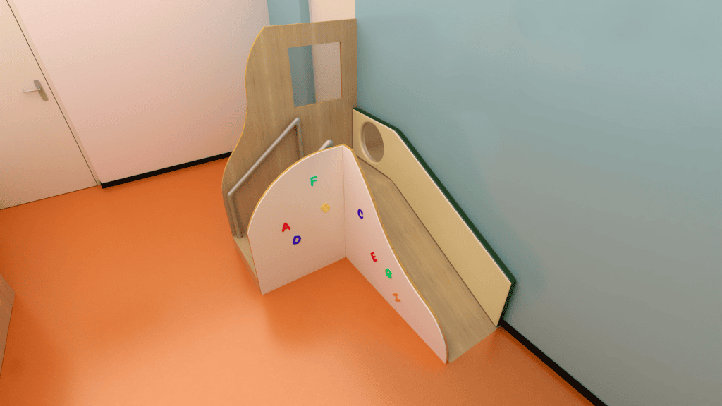 De ruimte wordt ook gebruikt door fysiotherapeuten, zodoende is in samenspraak een speel/klimhoek tot stand gekomen, met een stevige ondergrond en een magnetische wand waar eventuele doelen/oefeningen opgehangen kunnen worden.