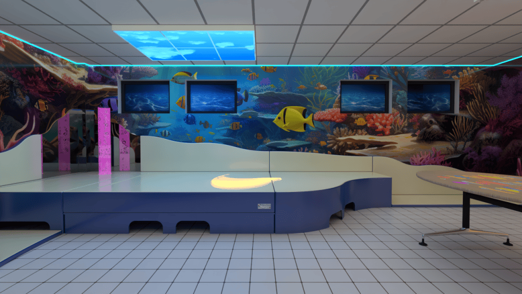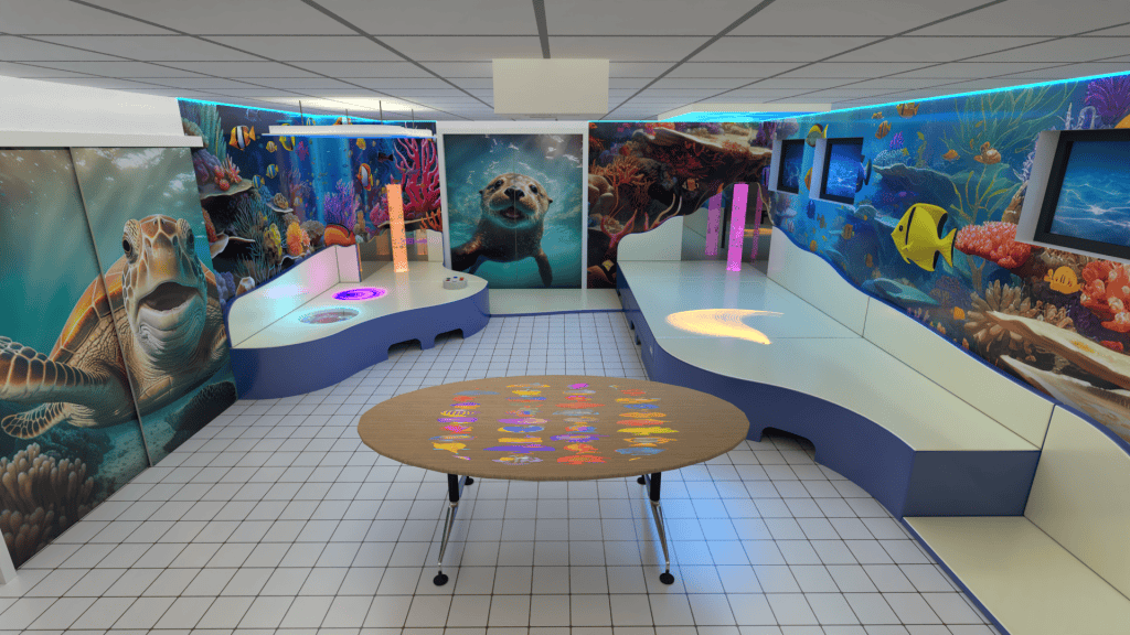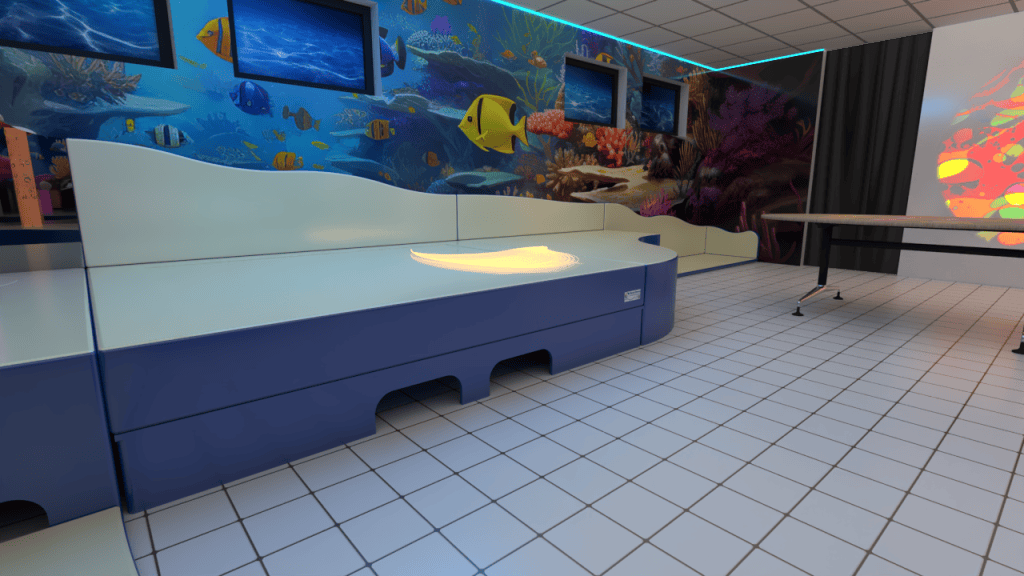 Om de verbinding met het geliefde zwembad te behouden, is er een onderwaterwereld gecreëerd. De ruimte bestaat uit een passieve hoek voor traditioneel snoezelen en een actieve hoek, waar veel meer interactie te vinden is en men zelf invloed kan uitoefenen op de eigen omgeving.